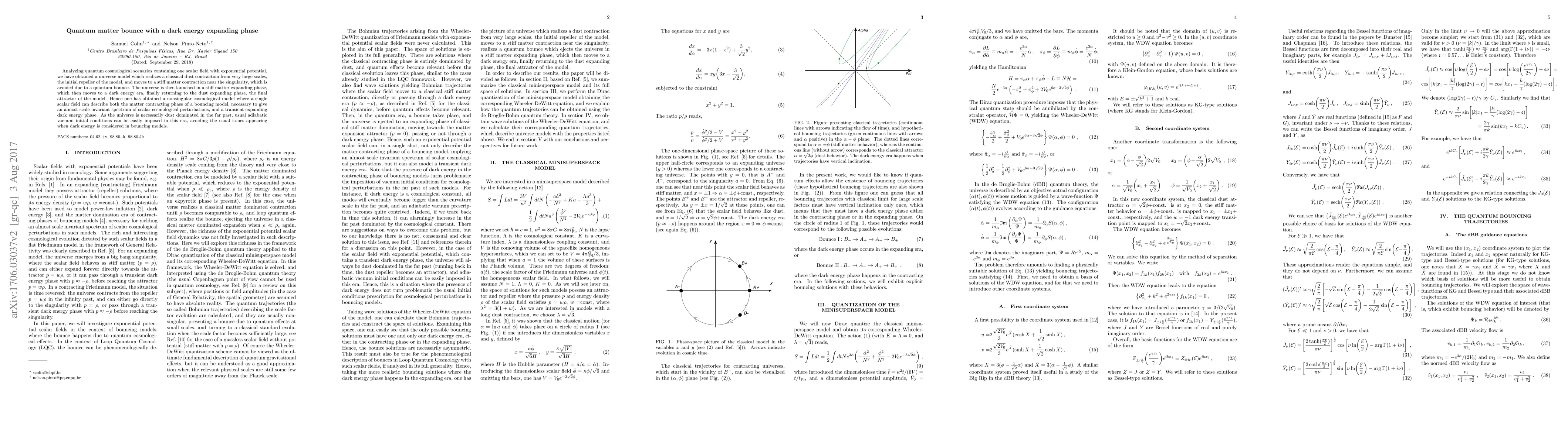 Analyzing quantum cosmological scenarios containing one scalar field with exponential potential, we have obtained a universe model which realizes a classical dust contraction from very large scales, the initial repeller of the model, and moves to a stiff matter contraction near the singularity, which is avoided due to a quantum bounce. The universe is then launched in a stiff matter expanding phase, which then moves to a dark energy era, finally returning to the dust expanding phase, the final attractor of the model. Hence one has obtained a nonsingular cosmological model where a single scalar field can describe both the matter contracting phase of a bouncing model, necessary to give an almost scale invariant spectrum of scalar cosmological perturbations, and a transient expanding dark energy phase. As the universe is necessarily dust dominated in the far past, usual adiabatic vacuum initial conditions can be easily imposed in this era, avoiding the usual issues appearing when dark energy is considered in bouncing models.