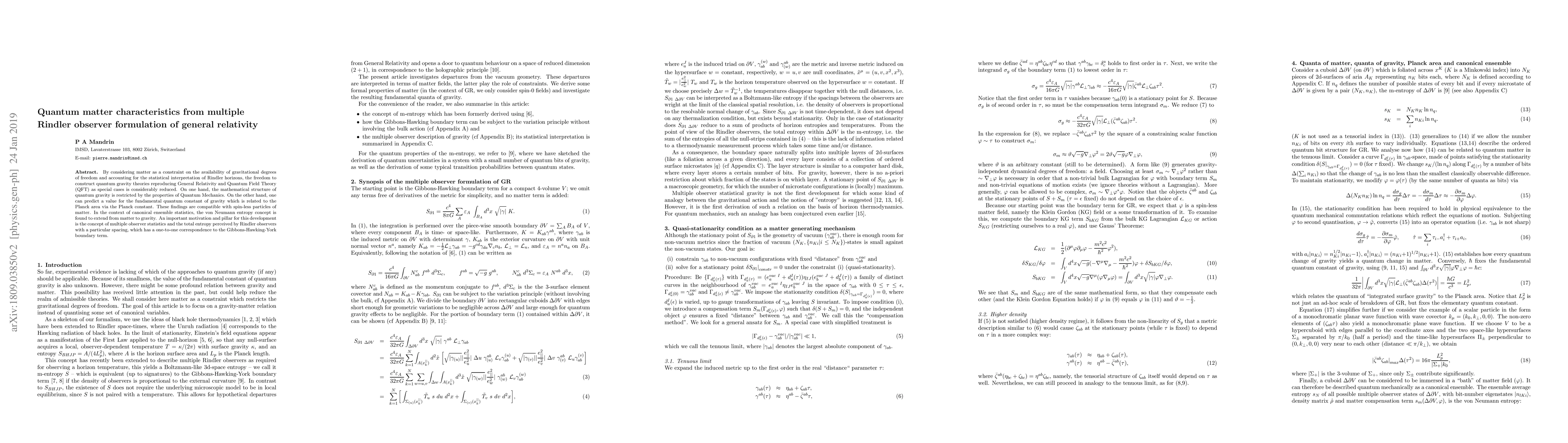 By considering matter as a constraint on the availability of gravitational degrees of freedom and accounting for the statistical interpretation of Rindler horizons, the freedom to construct quantum gravity theories reproducing General Relativity and Quantum Field Theory (QFT) as special cases is considerably reduced. On one hand, the mathematical structure of quantum gravity is restricted by the properties of Quantum Mechanics. On the other hand, one can predict a value for the fundamental quantum constant of gravity which is related to the Planck area via the Planck constant. These findings are compatible with spin-less particles of matter. In the context of canonical ensemble statistics, the von Neumann entropy concept is found to extend from matter to gravity. An important motivation and pillar for this development is the concept of multiple observer statistics and the total entropy perceived by Rindler observers with a particular spacing, which has a one-to-one correspondence to the Gibbons-Hawking-York boundary term.