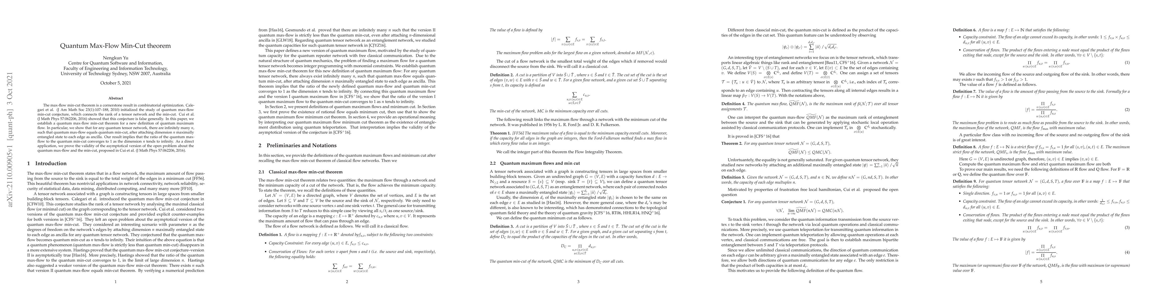 This paper establishes a quantum max-flow min-cut theorem for a redefined quantum maximum flow, showing that quantum max-flow equals quantum min-cut for infinitely many dimensions, implying the ratio converges to 1 as dimension tends to infinity. It resolves an open problem regarding the relationship between quantum max-flow and min-cut.