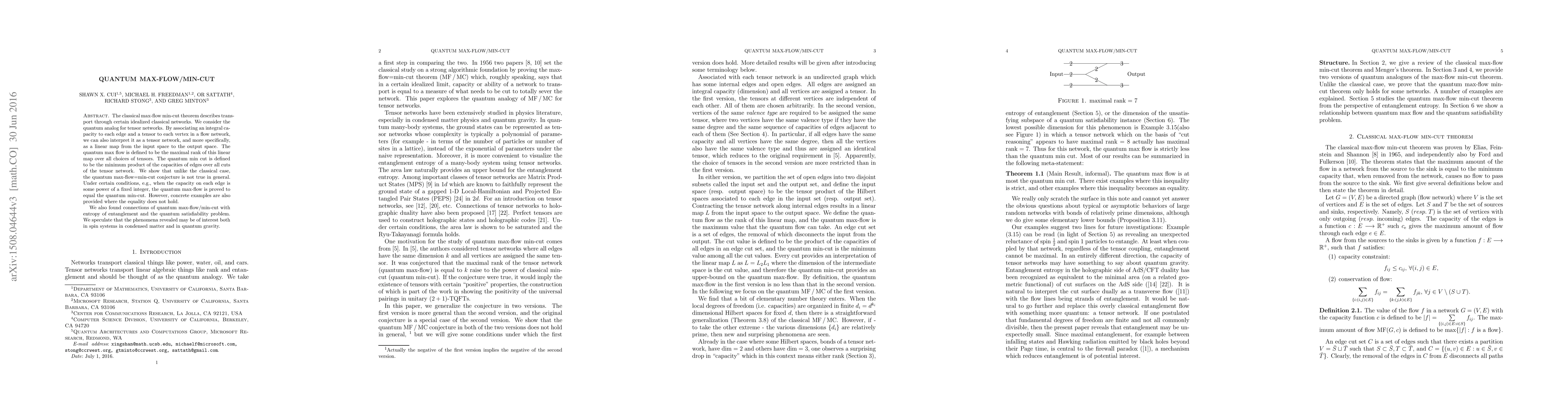 This paper explores the quantum analog of the classical max-flow min-cut theorem in tensor networks, demonstrating that the quantum max-flow equals the quantum min-cut under specific conditions but not universally. It also links these concepts to entanglement entropy and quantum satisfiability, suggesting potential relevance in quantum gravity and condensed matter physics.