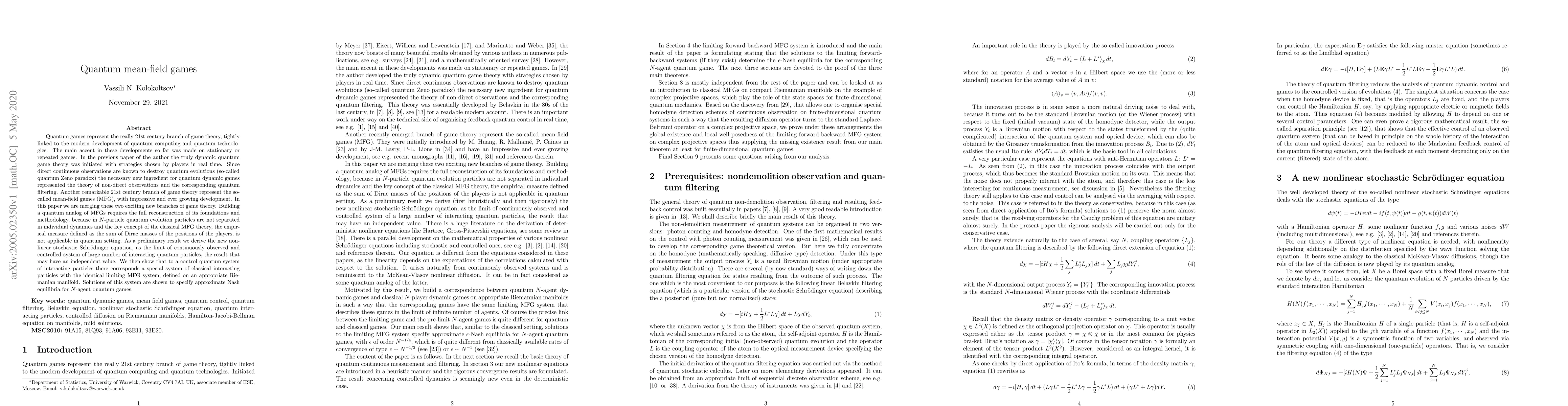 Quantum games represent the really 21st century branch of game theory, tightly linked to the modern development of quantum computing and quantum technologies. The main accent in these developments so far was made on stationary or repeated games. In the previous paper of the author the truly dynamic quantum game theory was initiated with strategies chosen by players in real time. Since direct continuous observations are known to destroy quantum evolutions (so-called quantum Zeno paradox) the necessary new ingredient for quantum dynamic games represented the theory of non-direct observations and the corresponding quantum filtering. Another remarkable 21st century branch of game theory represent the so-called mean-field games (MFG), with impressive and ever growing development. In this paper we are merging these two exciting new branches of game theory. Building a quantum analog of MFGs requires the full reconstruction of its foundations and methodology, because in $N$-particle quantum evolution particles are not separated in individual dynamics and the key concept of the classical MFG theory, the empirical measure defined as the sum of Dirac masses of the positions of the players, is not applicable in quantum setting. As a preliminary result we derive the new nonlinear stochastic Schr\"odinger equation, as the limit of continuously observed and controlled system of large number of interacting quantum particles, the result that may have an independent value. We then show that to a control quantum system of interacting particles there corresponds a special system of classical interacting particles with the identical limiting MFG system, defined on an appropriate Riemanian manifold. Solutions of this system are shown to specify approximate Nash equilibria for $N$-agent quantum games.