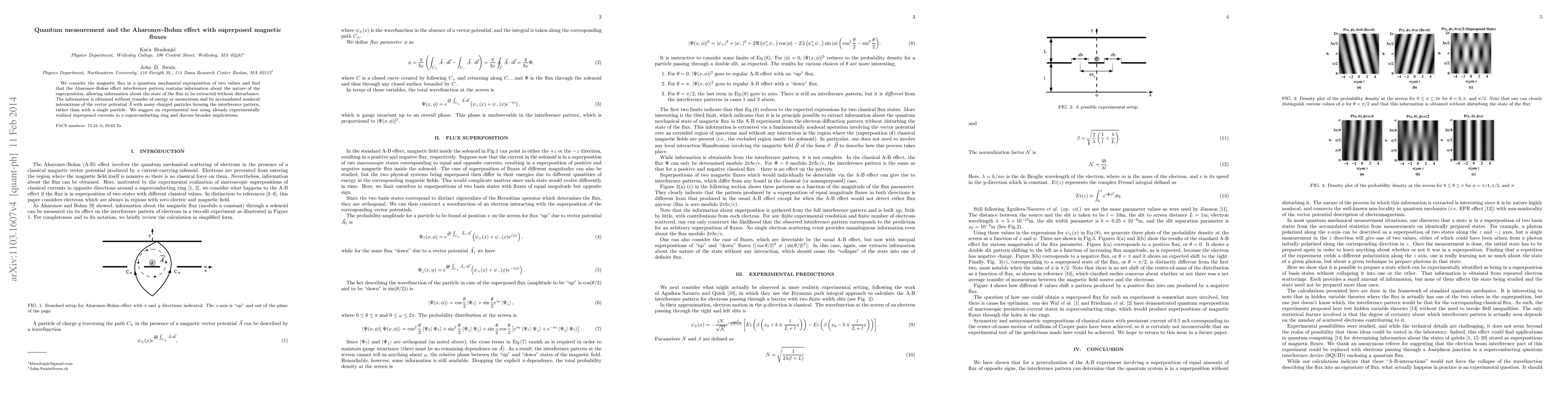 We consider the magnetic flux in a quantum mechanical superposition of two values and find that the Aharonov-Bohm effect interference pattern contains information about the nature of the superposition, allowing information about the state of the flux to be extracted without disturbance. The information is obtained without transfer of energy or momentum and by accumulated nonlocal interactions of the vector potential $\vec{A}$ with many charged particles forming the interference pattern, rather than with a single particle. We suggest an experimental test using already experimentally realized superposed currents in a superconducting ring and discuss broader implications.