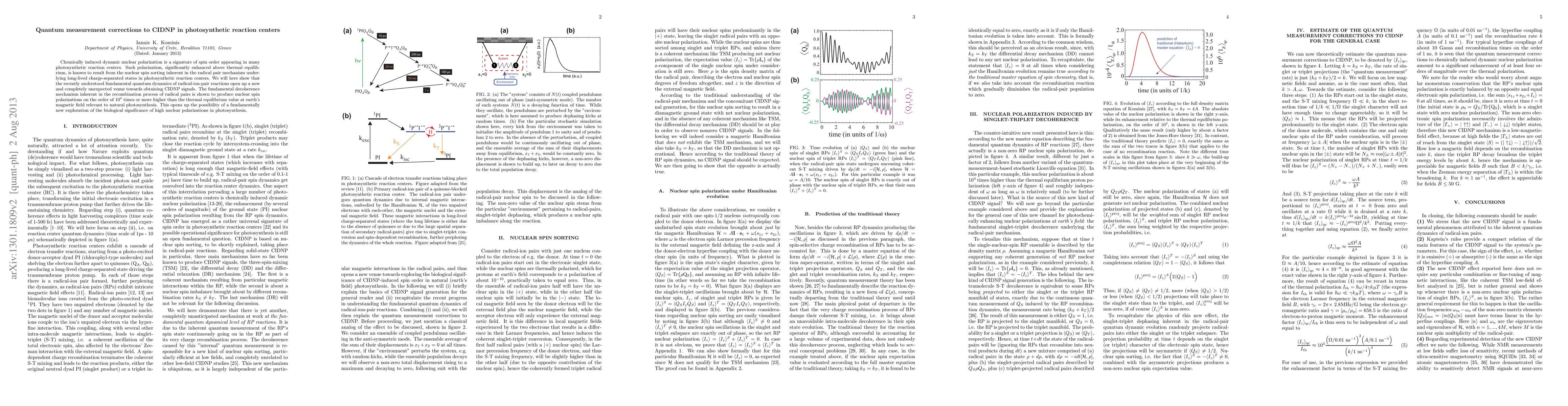This paper explores how quantum measurement corrections influence chemically induced dynamic nuclear polarization (CIDNP) in photosynthetic reaction centers. It reveals that the fundamental decoherence mechanism during the recombination of radical pairs can generate nuclear spin polarizations significantly higher than thermal equilibrium, offering new insights into the biological role of high nuclear polarizations in photosynthesis.