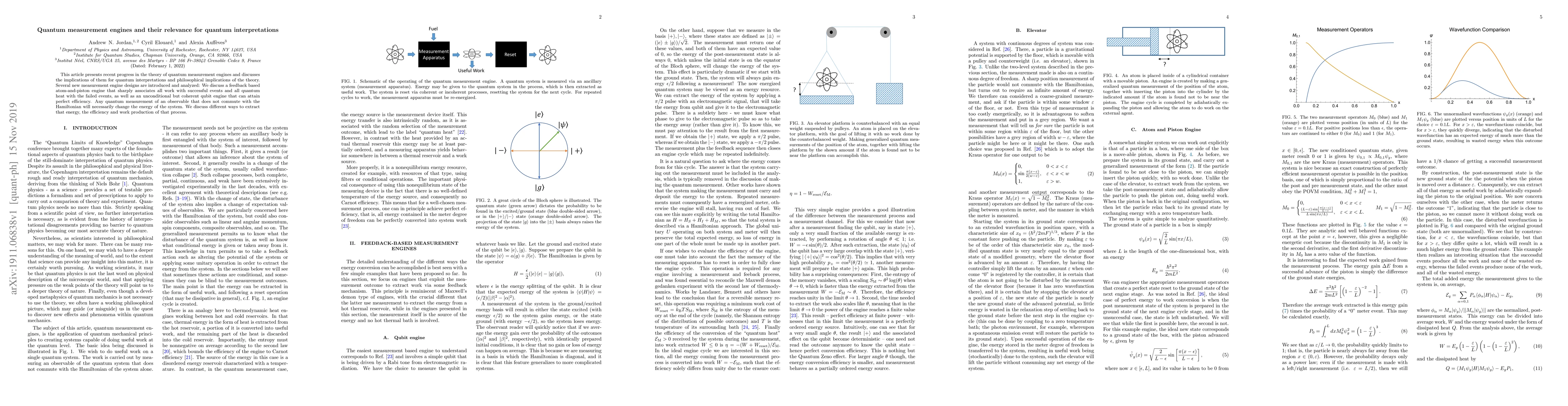 This article presents recent progress in the theory of quantum measurement engines and discusses the implications of them for quantum interpretations and philosophical implications of the theory. Several new measurement engine designs are introduced and analyzed: We discuss a feedback based atom-and-piston engine that sharply associates all work with successful events and all quantum heat with the failed events, as well as an unconditional but coherent qubit engine that can attain perfect efficiency. Any quantum measurement of an observable that does not commute with the Hamiltonian will necessarily change the energy of the system. We discuss different ways to extract that energy, the efficiency and work production of that process.