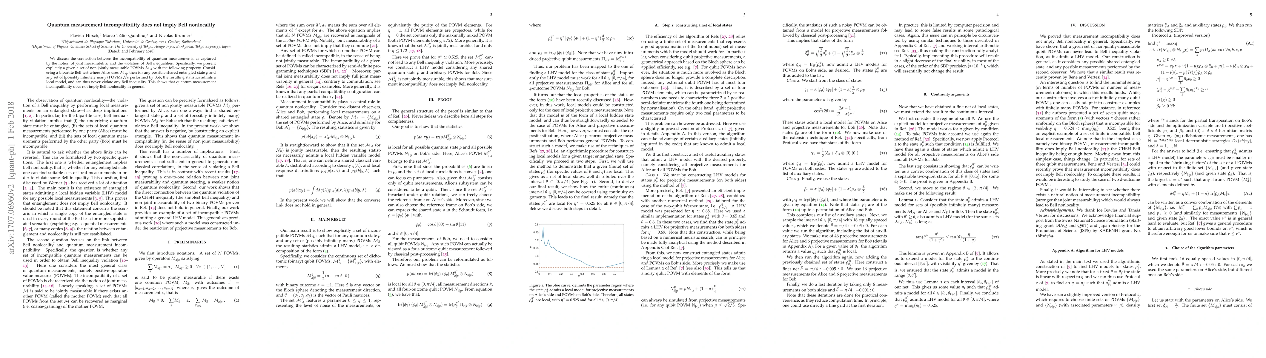 This paper demonstrates that quantum measurement incompatibility does not necessarily imply Bell nonlocality. It shows that even when measurements are not jointly measurable, the resulting statistics can still be explained by a local hidden variable model, thus never violating Bell inequalities.
