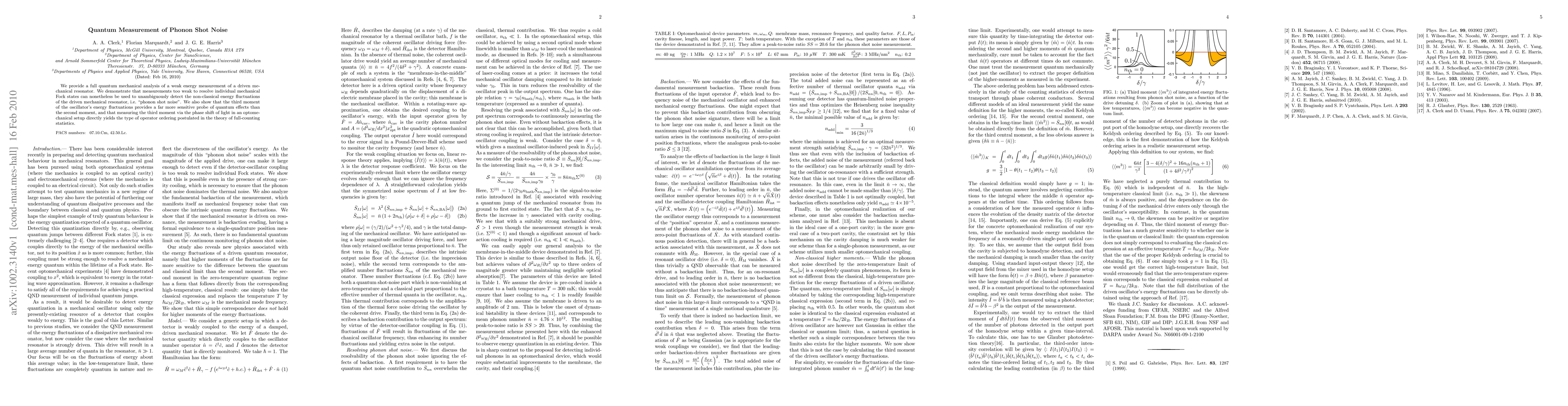 The paper presents a quantum mechanical analysis of weak energy measurements in driven mechanical resonators, demonstrating the detection of phonon shot noise and the sensitivity of higher moments to quantum effects.