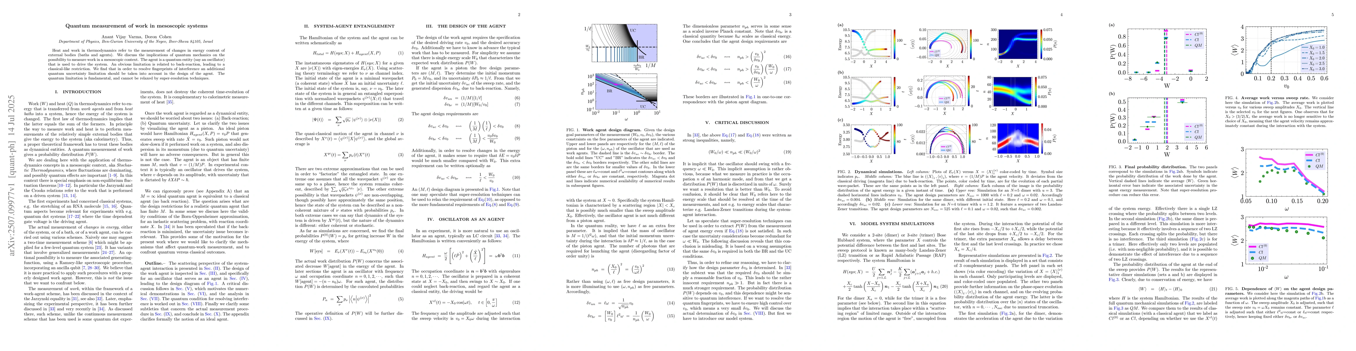The paper discusses quantum measurement of work in mesoscopic systems, focusing on the limitations imposed by quantum mechanics and back-reaction on the design of a quantum work agent.