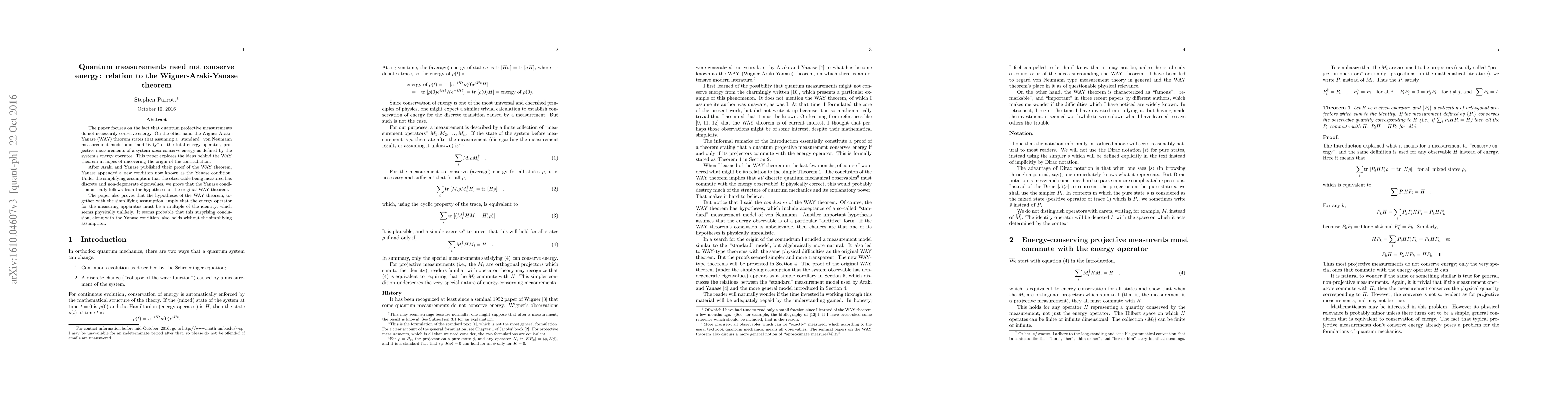 The paper focuses on the fact that quantum projective measurements do not necessarily conserve energy. On the other hand the Wigner-Araki-Yanase (WAY) theorem states that assuming a "standard" von Neumann measurement model and "additivity" of the total energy operator, projective measurements of a system must conserve energy as defined by the system's energy operator. This paper explores the ideas behind the WAY theorem in hopes of uncovering the origin of the contradiction. After Araki and Yanase published their proof of the WAY theorem, Yanase appended a new condition now known as the Yanase condition. Under the simplifying assumption that the observable being measured has discrete and non-degenerate eigenvalues, we prove that the Yanase condition actually follows from the hypotheses of the original WAY theorem. The paper also proves that the hypotheses of the WAY theorem, together with the simplifying assumption, imply that the energy operator for the measuring apparatus must be a multiple of the identity, which seems physically unlikely. It seems probable that this surprising conclusion, along with the Yanase condition, also holds without the simplifying assumption.