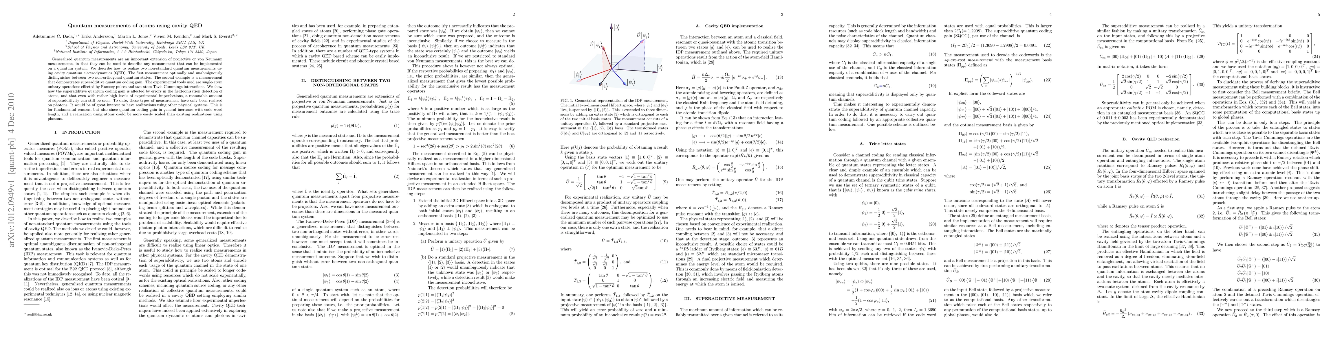 Generalized quantum measurements are an important extension of projective or von Neumann measurements, in that they can be used to describe any measurement that can be implemented on a quantum system. We describe how to realize two non-standard quantum measurements using cavity quantum electrodynamics (QED). The first measurement optimally and unabmiguously distinguishes between two non-orthogonal quantum states. The second example is a measurement that demonstrates superadditive quantum coding gain. The experimental tools used are single-atom unitary operations effected by Ramsey pulses and two-atom Tavis-Cummings interactions. We show how the superadditive quantum coding gain is affected by errors in the field-ionisation detection of atoms, and that even with rather high levels of experimental imperfections, a reasonable amount of superadditivity can still be seen. To date, these types of measurement have only been realized on photons. It would be of great interest to have realizations using other physical systems. This is for fundamental reasons, but also since quantum coding gain in general increases with code word length, and a realization using atoms could be more easily scaled than existing realizations using photons.