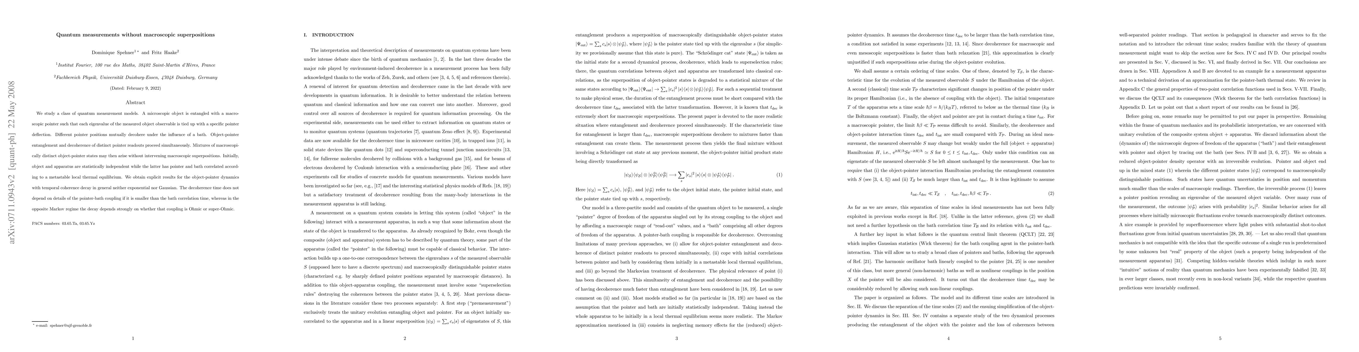 Researchers found that quantum measurements can occur without creating macroscopic superpositions, allowing for mixing of distinct states. The decoherence time depends on the coupling between the pointer and bath, but not on the details of the coupling if it is smaller than the bath correlation time.
