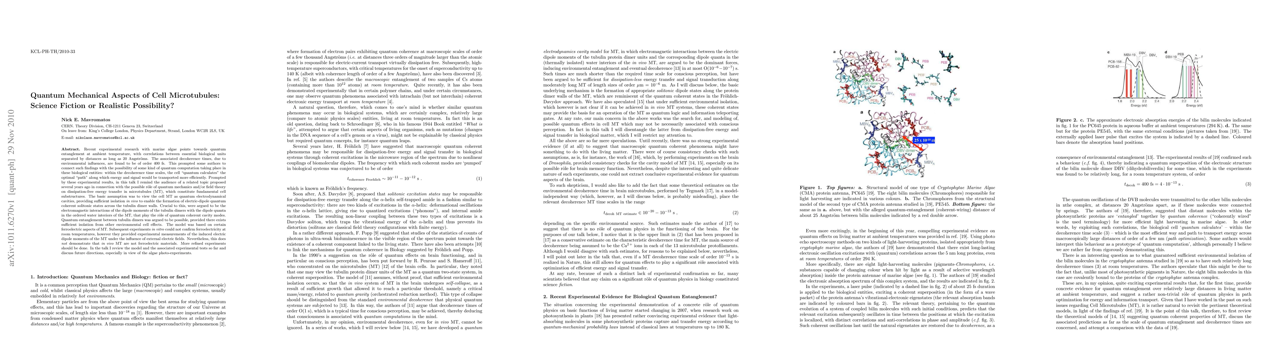 Recent experimental research with marine algae points towards quantum entanglement at ambient temperature, with correlations between essential biological units separated by distances as long as 20 Angstr\"oms. The associated decoherence times, due to environmental influences, are found to be of order 400 fs. This prompted some authors to connect such findings with the possibility of some kind of quantum computation taking place in these biological entities: within the decoherence time scales, the cell "quantum calculates" the optimal "path" along which energy and signal would be transported more efficiently. Prompted by these experimental results, in this talk I remind the audience of a related topic proposed several years ago in connection with the possible r\^ole of quantum mechanics and/or field theory on dissipation-free energy transfer in microtubules (MT), which constitute fundamental cell substructures. Quantum entanglement between tubulin dimers was argued to be possible, provided there exists sufficient isolation from other environmental cell effects. The model was based on certain ferroelectric aspects of MT. In the talk I review the model and the associated experimental tests so far and discuss future directions, especially in view of the algae photo-experiments.