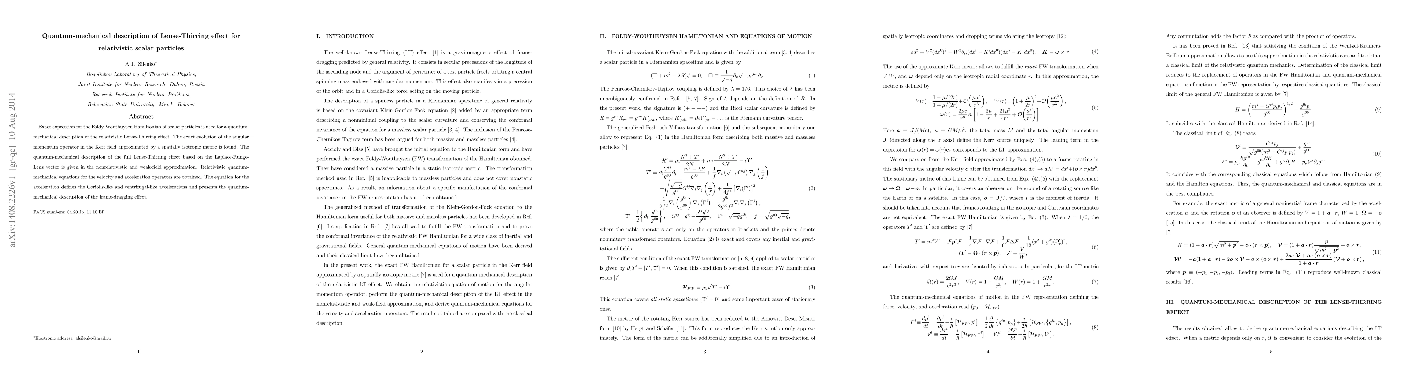 Exact expression for the Foldy-Wouthuysen Hamiltonian of scalar particles is used for a quantum-mechanical description of the relativistic Lense-Thirring effect. The exact evolution of the angular momentum operator in the Kerr field approximated by a spatially isotropic metric is found. The quantum-mechanical description of the full Lense-Thirring effect based on the Laplace-Runge-Lenz vector is given in the nonrelativistic and weak-field approximation. Relativistic quantum-mechanical equations for the velocity and acceleration operators are obtained. The equation for the acceleration defines the Coriolis-like and centrifugal-like accelerations and presents the quantum-mechanical description of the frame-dragging effect.