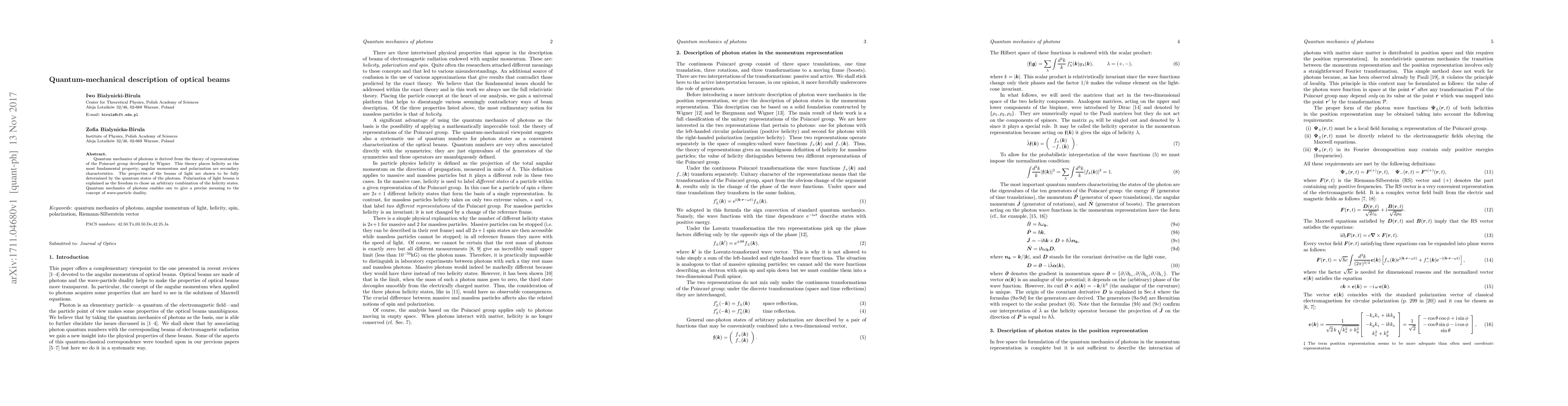 Quantum mechanics of photons is derived from the theory of representations of the Poincar\'e group developed by Wigner. This theory places helicity as the most fundamental property; angular momentum and polarization are secondary characteristics. The properties of the beams of light are shown to be fully determined by the quantum states of the photons. Polarization of light beams is explained as the freedom to chose an arbitrary combination of the helicity states. Quantum mechanics of photons enables one to give a precise meaning to the concept of wave-particle duality.