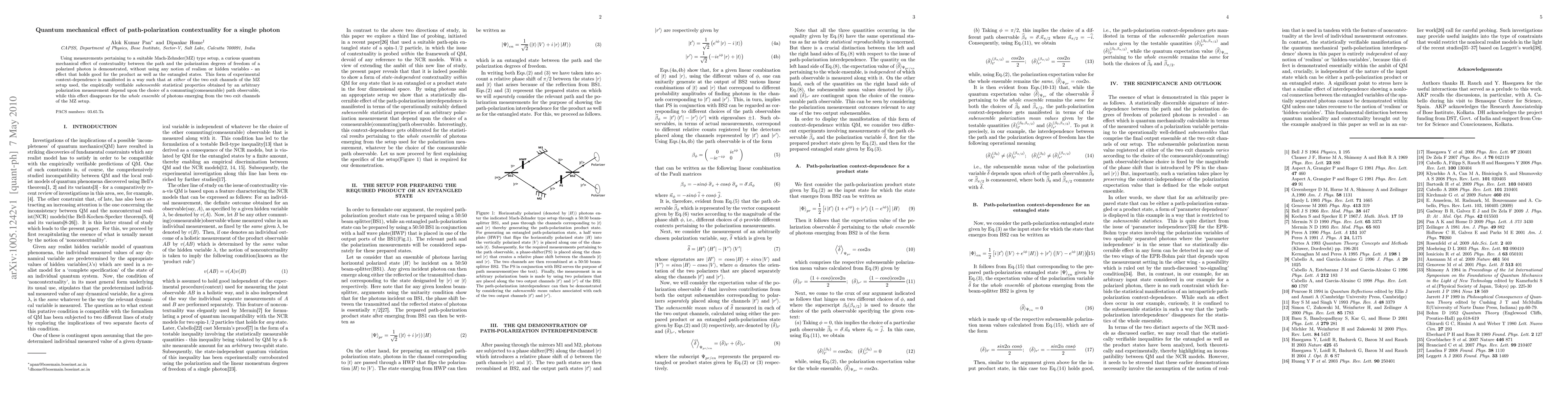 This paper demonstrates a quantum mechanical effect of contextuality between path and polarization degrees of freedom in a single photon using a Mach-Zehnder setup, showing that statistical properties of subensembles depend on path measurements, while the effect vanishes for the whole ensemble. This context-dependence does not rely on realism or hidden variables.