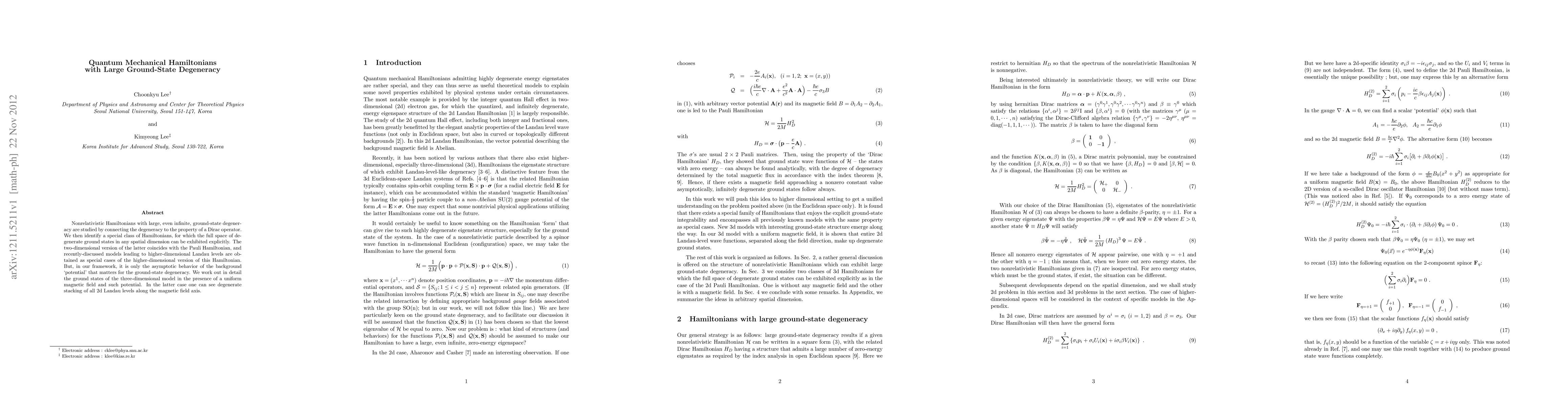 Researchers studied nonrelativistic Hamiltonians with large ground-state degeneracy and found that a Dirac operator property determines this degeneracy. They identified a special class of Hamiltonians with explicit full space of degenerate ground states in higher dimensions.