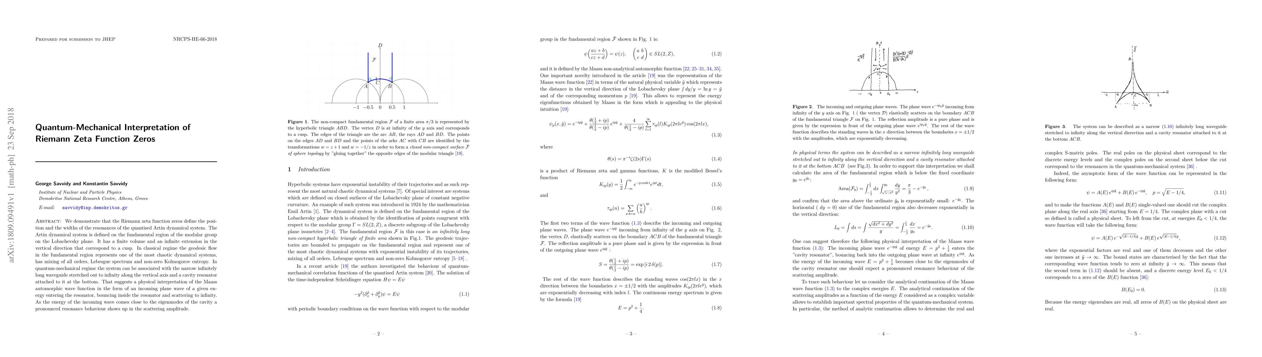 We demonstrate that the Riemann zeta function zeros define the position and the widths of the resonances of the quantised Artin dynamical system. The Artin dynamical system is defined on the fundamental region of the modular group on the Lobachevsky plane. It has a finite volume and an infinite extension in the vertical direction that correspond to a cusp. In classical regime the geodesic flow in the fundamental region represents one of the most chaotic dynamical systems, has mixing of all orders, Lebesgue spectrum and non-zero Kolmogorov entropy. In quantum-mechanical regime the system can be associated with the narrow infinitely long waveguide stretched out to infinity along the vertical axis and a cavity resonator attached to it at the bottom. That suggests a physical interpretation of the Maass automorphic wave function in the form of an incoming plane wave of a given energy entering the resonator, bouncing inside the resonator and scattering to infinity. As the energy of the incoming wave comes close to the eigenmodes of the cavity a pronounced resonance behaviour shows up in the scattering amplitude.
