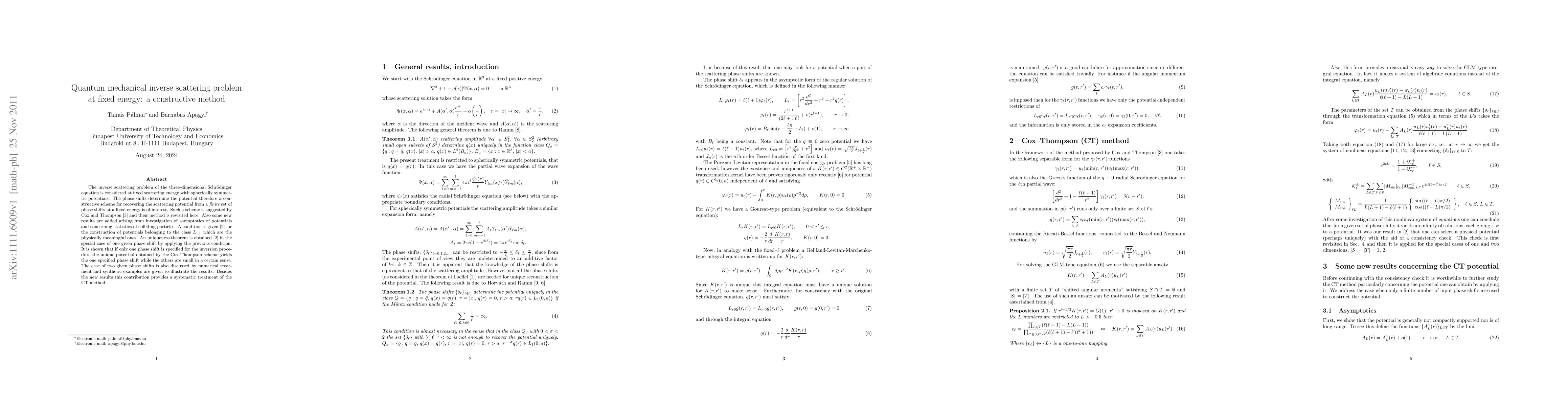 The inverse scattering problem of the three-dimensional Schroedinger equation is considered at fixed scattering energy with spherically symmetric potentials. The phase shifts determine the potential therefore a constructive scheme for recovering the scattering potential from a finite set of phase shifts at a fixed energy is of interest. Such a scheme is suggested by Cox and Thompson [3] and their method is revisited here. Also some new results are added arising from investigation of asymptotics of potentials and concerning statistics of colliding particles. A condition is given [2] for the construction of potentials belonging to the class L_1,1 which are the physically meaningful ones. An uniqueness theorem is obtained [2] in the special case of one given phase shift by applying the previous condition. It is shown that if only one phase shift is specified for the inversion procedure the unique potential obtained by the Cox-Thompson scheme yields the one specified phase shift while the others are small in a certain sense. The case of two given phase shifts is also discussed by numerical treatment and synthetic examples are given to illustrate the results. Besides the new results this contribution provides a systematic treatment of the CT method.