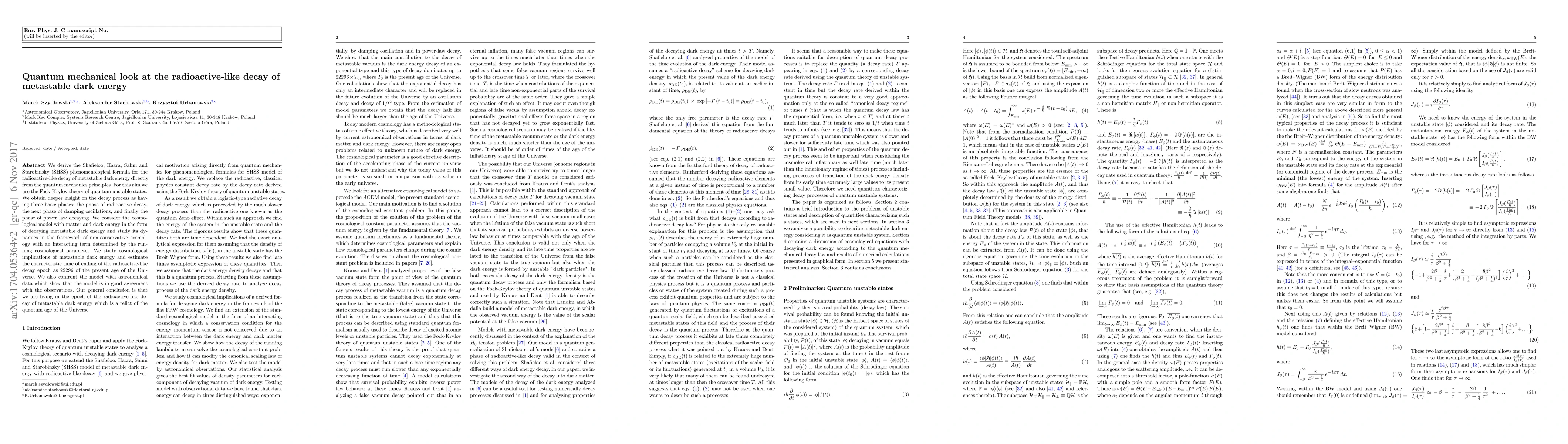 This paper derives the SHSS formula for the radioactive-like decay of metastable dark energy from quantum mechanics, identifying three decay phases: radioactive decay, damping oscillations, and power law decay. It aligns the model with cosmological observations, estimating the end of the decay epoch at 22296 years into the future.