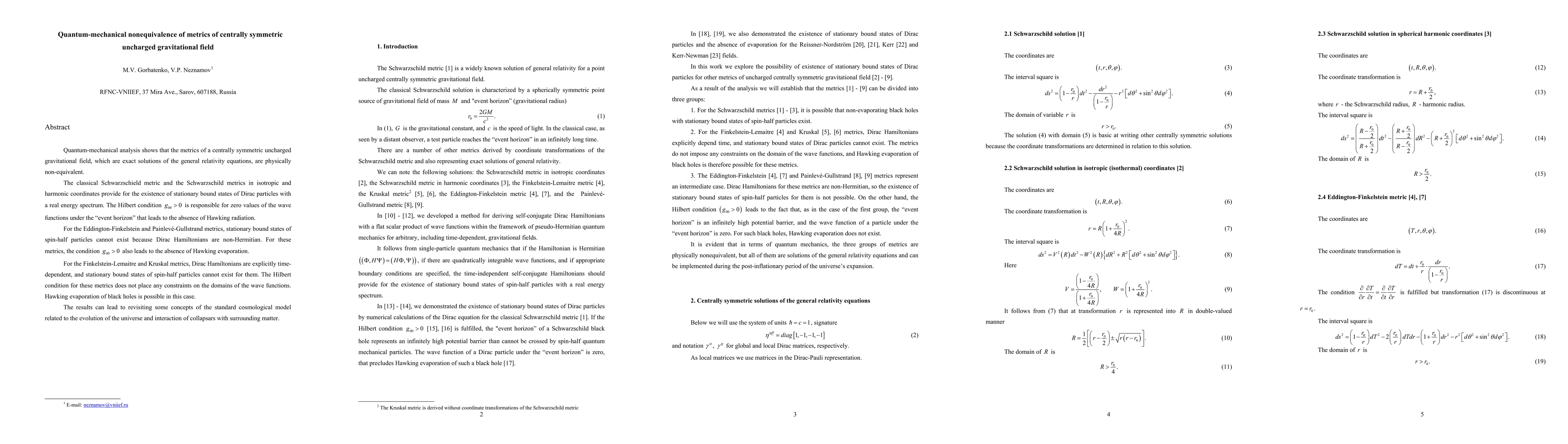 Quantum-mechanical analysis shows that the metrics of a centrally symmetric uncharged gravitational field, which are exact solutions of the general relativity equations, are physically non-equivalent. The classical Schwarzschield metric and the Schwarzschild metrics in isotropic and harmonic coordinates provide for the existence of stationary bound states of Dirac particles with a real energy spectrum. The Hilbert condition g_{00}>0 is responsible for zero values of the wave functions under the "event horizon" that leads to the absence of Hawking radiation. For the Eddington-Finkelstein and Painleve-Gullstrand metrics, stationary bound states of spin-half particles cannot exist because Dirac Hamiltonians are non-Hermitian. For these metrics, the condition g_{00}>0 also leads to the absence of Hawking evaporation. For the Finkelstein-Lemaitre and Kruskal metrics, Dirac Hamiltonians are explicitly time-dependent, and stationary bound states of spin-half particles cannot exist for them. The Hilbert condition for these metrics does not place any constraints on the domains of the wave functions. Hawking evaporation of black holes is possible in this case. The results can lead to revisiting some concepts of the standard cosmological model related to the evolution of the universe and interaction of collapsars with surrounding matter.