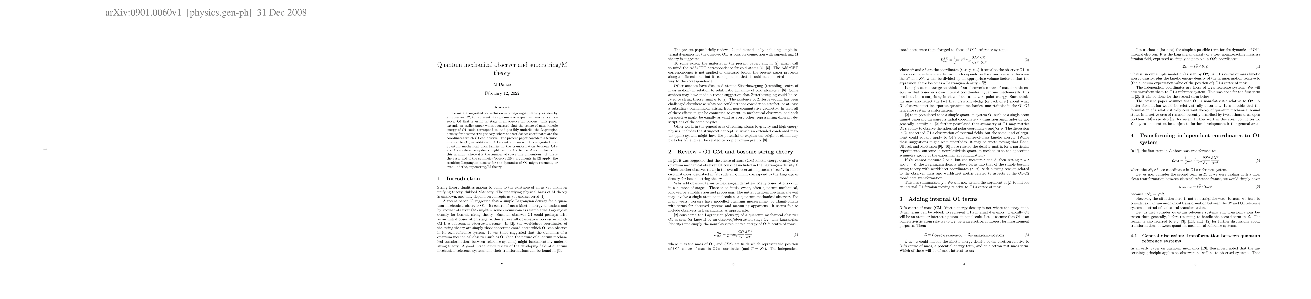 Terms are suggested for inclusion in a Lagrangian density as seen by an observer O2, to represent the dynamics of a quantum mechanical observer O1 that is an initial stage in an observation process. This paper extends an earlier paper which suggested that the centre-of-mass kinetic energy of O1 could correspond to, and possibly underlie, the Lagrangian density for bosonic string theory, where the worldsheet coordinates are the coordinates which O1 can observe. The present paper considers a fermion internal to O1, in addition to O1's centre of mass. It is suggested that quantum mechanical uncertainties in the transformation between O1's and O2's reference systems might require O2 to use $d$ spinor fields for this fermion, where $d$ is the number of spacetime dimensions. If this is the case, and if the symmetry/observability arguments in arXiv:hep-th/0601104 apply, the resulting Lagrangian density for the dynamics of O1 might resemble, or even underlie, superstring/M theory.