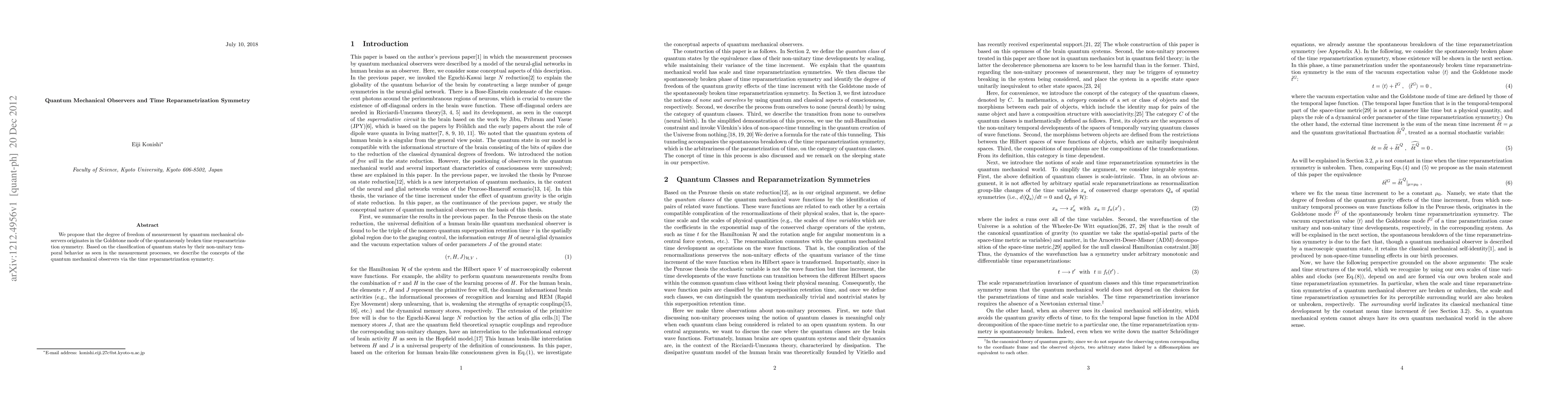 We propose that the degree of freedom of measurement by quantum mechanical observers originates in the Goldstone mode of the spontaneously broken time reparametrization symmetry. Based on the classification of quantum states by their non-unitary temporal behavior as seen in the measurement processes, we describe the concepts of the quantum mechanical observers via the time reparametrization symmetry.