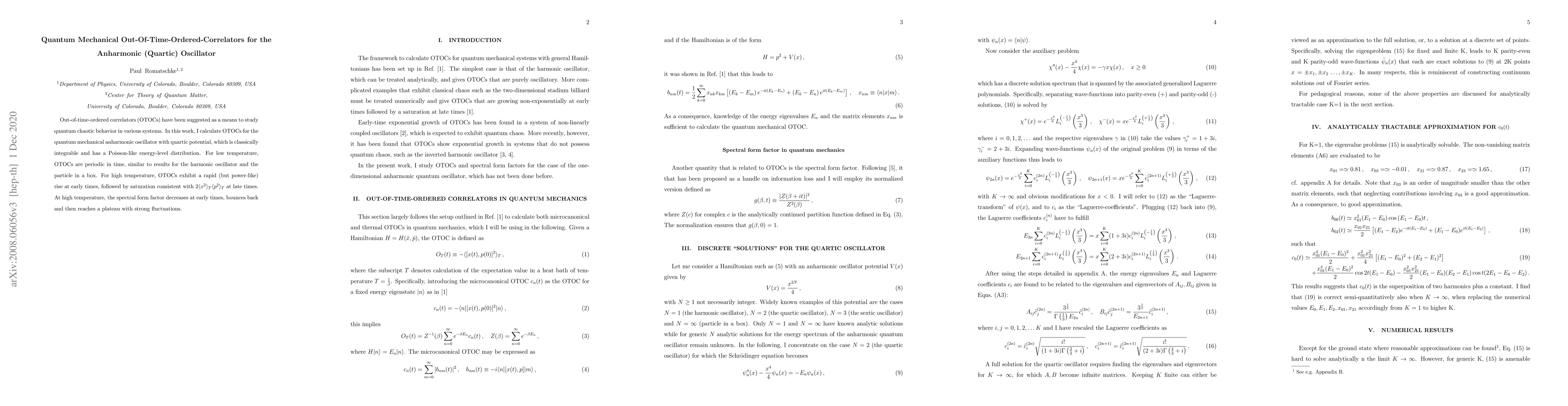 This paper calculates out-of-time-ordered correlators (OTOCs) for a quantum mechanical anharmonic oscillator with quartic potential, revealing periodic behavior at low temperatures and a power-like rise followed by saturation at high temperatures. The spectral form factor exhibits early-time decrease, a bounce, and a late-time plateau with strong fluctuations.