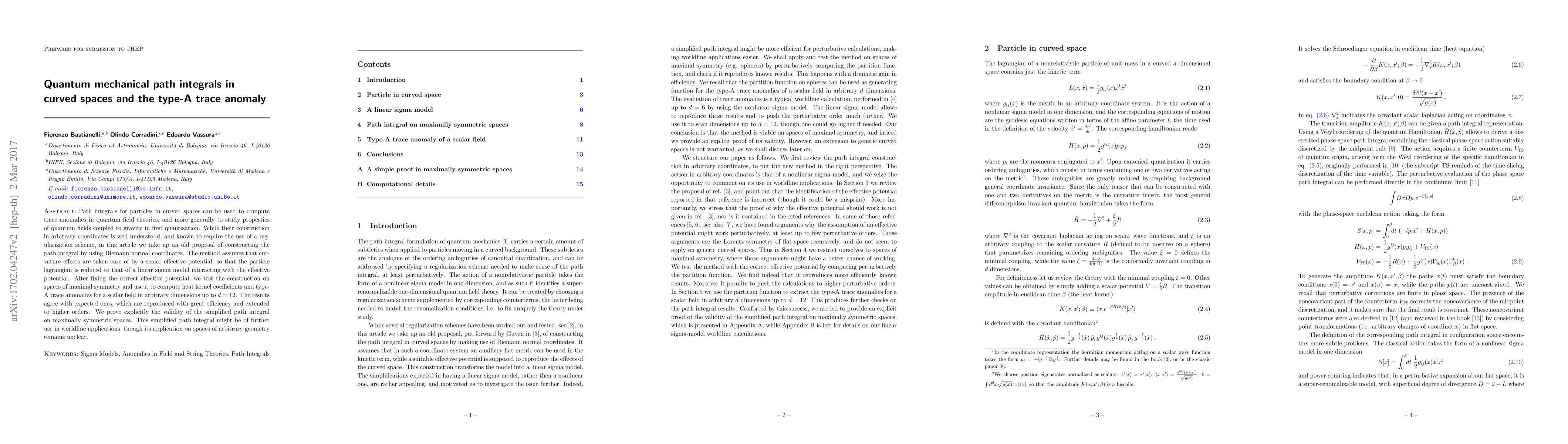 Path integrals for particles in curved spaces can be used to compute trace anomalies in quantum field theories, and more generally to study properties of quantum fields coupled to gravity in first quantization. While their construction in arbitrary coordinates is well understood, and known to require the use of a regularization scheme, in this article we take up an old proposal of constructing the path integral by using Riemann normal coordinates. The method assumes that curvature effects are taken care of by a scalar effective potential, so that the particle lagrangian is reduced to that of a linear sigma model interacting with the effective potential. After fixing the correct effective potential, we test the construction on spaces of maximal symmetry and use it to compute heat kernel coefficients and type-A trace anomalies for a scalar field in arbitrary dimensions up to d=12. The results agree with expected ones, which are reproduced with great efficiency and extended to higher orders. We prove explicitly the validity of the simplified path integral on maximally symmetric spaces. This simplified path integral might be of further use in worldline applications, though its application on spaces of arbitrary geometry remains unclear.