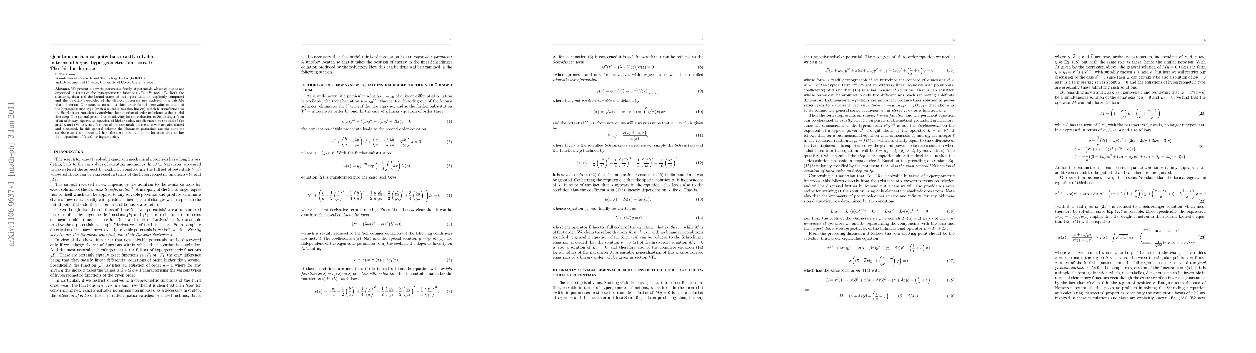 We present a new six-parameter family of potentials whose solutions are expressed in terms of the hypergeometric functions 3F2, 2F2 and 1F2. Both the scattering data and the bound states of these potentials are explicitly computed and the peculiar properties of the discrete spectrum are depicted in a suitable phase diagram. Our starting point is a third-order formal eigenvalue equation of the hypergeometric type (with a suitable solution known) which is transformed to the Schr\"odinger equation by applying the reduction of order technique as the crucial first step. The general preconditions allowing for the reduction to Schr\"odinger form of an arbitrary eigenvalue equation of higher order, are discussed at the end of the article, and two universal features of the potentials arising this way are also stated and discussed. In this general scheme the Natanzon potentials are the simplest special case, those presented here the next ones, and so on for potentials arising from equations of fourth or higher order.