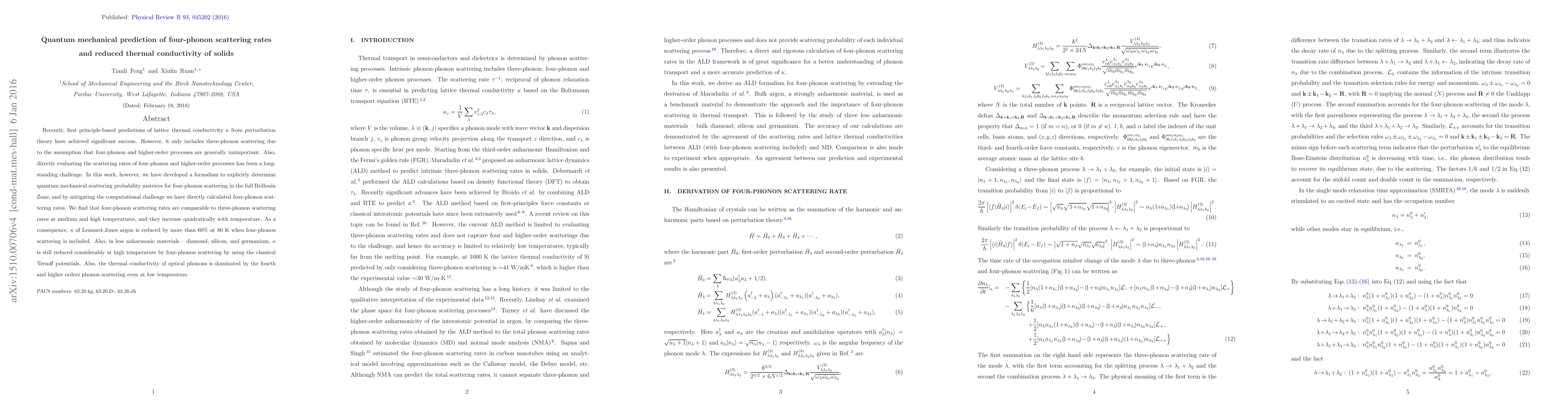This paper develops a formalism to calculate four-phonon scattering rates, revealing they are significant at medium and high temperatures, reducing thermal conductivity by over 60% in argon at 80 K and considerably in less anharmonic materials like diamond, silicon, and germanium at high temperatures.