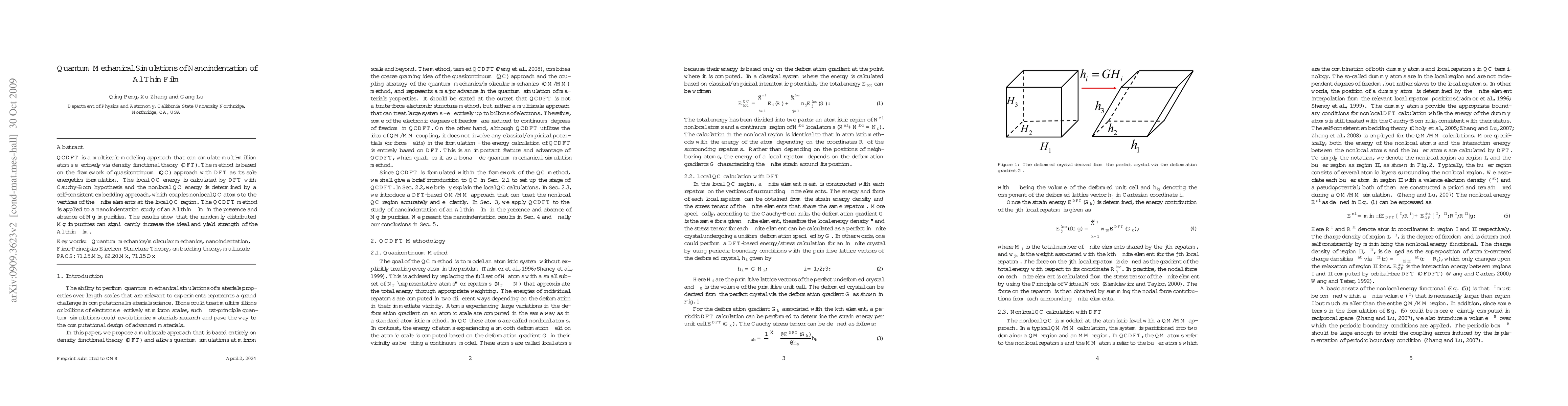 QCDFT is a multiscale modeling approach that can simulate multi-million atoms effectively via density functional theory (DFT). The method is based on the framework of quasicontinuum (QC) approach with DFT as its sole energetics formulation. The local QC energy is calculated by DFT with Cauchy-Born hypothesis and the nonlocal QC energy is determined by a self-consistent embedding approach, which couples nonlocal QC atoms to the vertices of the finite-elements at the local QC region. The QCDFT method is applied to a nanoindentation study of an Al thin film in the presence and absence of Mg impurities. The results show that the randomly distributed Mg impurities can significantly increase the ideal and yield strength of the Al thin film.