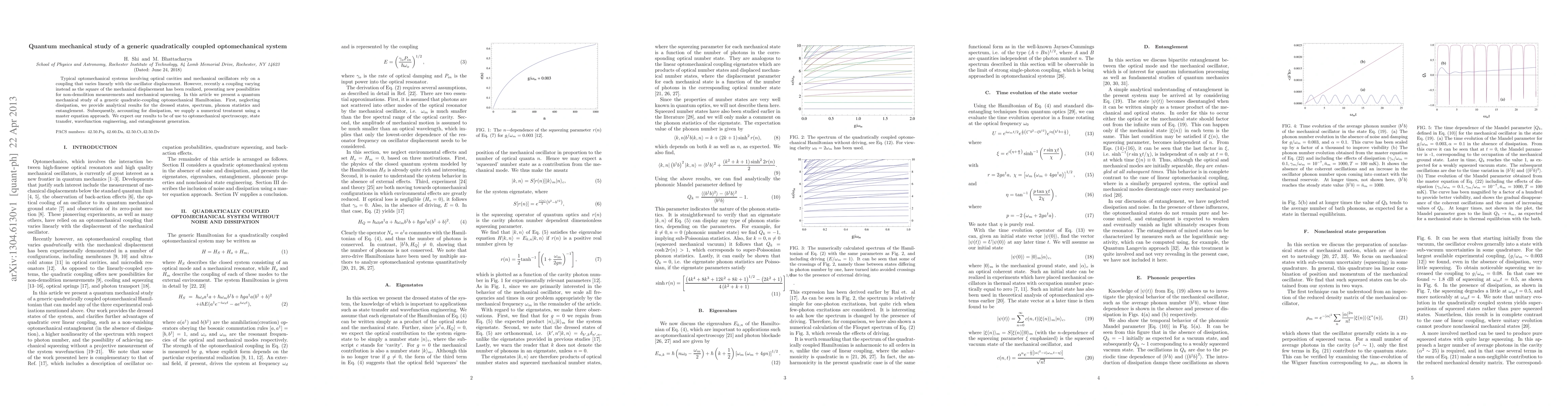 This paper studies a quadratically coupled optomechanical system, deriving analytical results for dressed states and phonon statistics without dissipation, and providing a numerical treatment for dissipative effects. The findings are expected to aid in optomechanical spectroscopy, state transfer, wavefunction engineering, and entanglement generation.