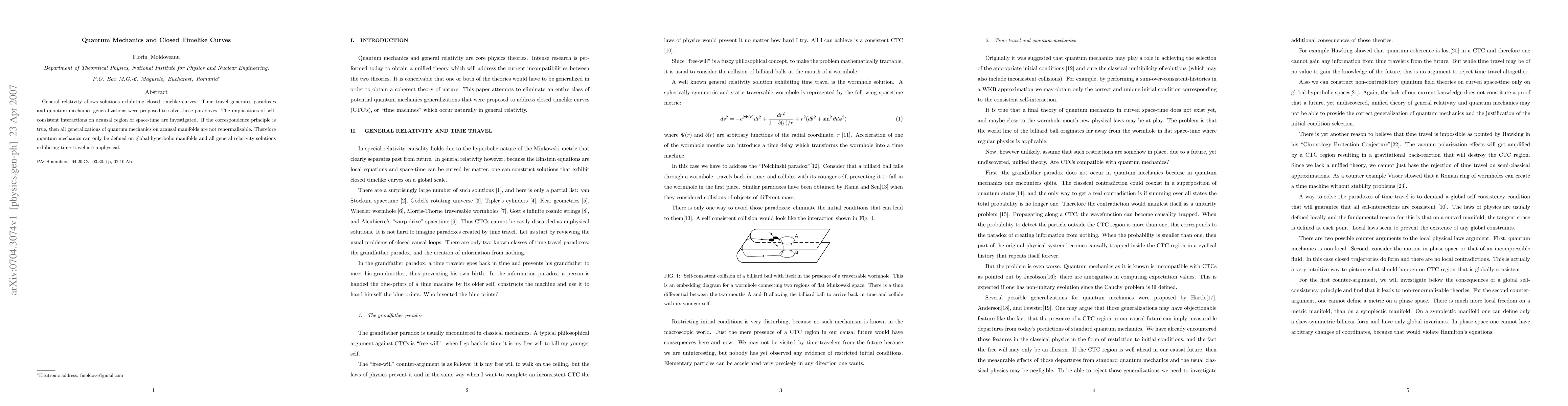 This paper investigates the implications of closed timelike curves in general relativity, proposing that quantum mechanics generalizations cannot resolve paradoxes in acausal regions. It concludes that if the correspondence principle holds, quantum mechanics is only applicable on global hyperbolic manifolds, deeming time travel solutions in general relativity unphysical.