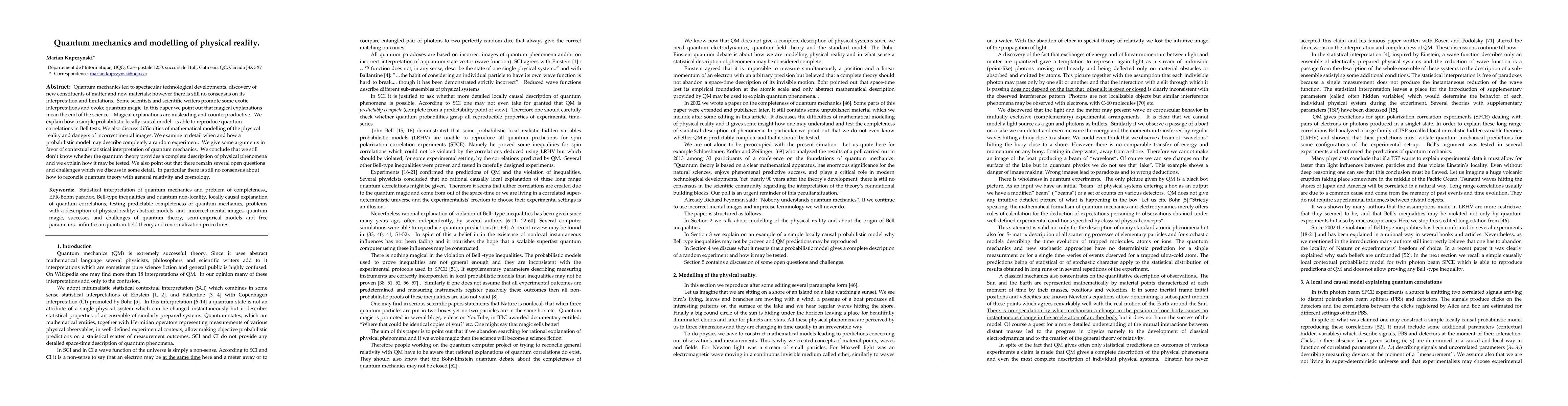 Quantum mechanics led to spectacular technological developments, discovery of new constituents of matter and new materials. However there is still no consensus on its interpretation and limitations. Some scientists and scientific writers promote some exotic interpretations and evoke quantum magic. In this paper we point out that magical explanations mean the end of the science. Magical explanations are misleading and counterproductive. We explain how a simple probabilistic locally causal model is able to reproduce quantum correlations in Bell tests. We also discuss difficulties of mathematical modelling of the physical reality and dangers of incorrect mental images. We examine in detail when and how a probabilistic model may describe completely a random experiment. We give some arguments in favor of contextual statistical interpretation of quantum mechanics. We conclude that we still do not know whether the quantum theory provides a complete description of physical phenomena and we explain how it may be tested. We also point out that there remain several open questions and challenges which we discuss in some detail. In particular there is still no consensus about how to reconcile quantum theory with general relativity and cosmology.