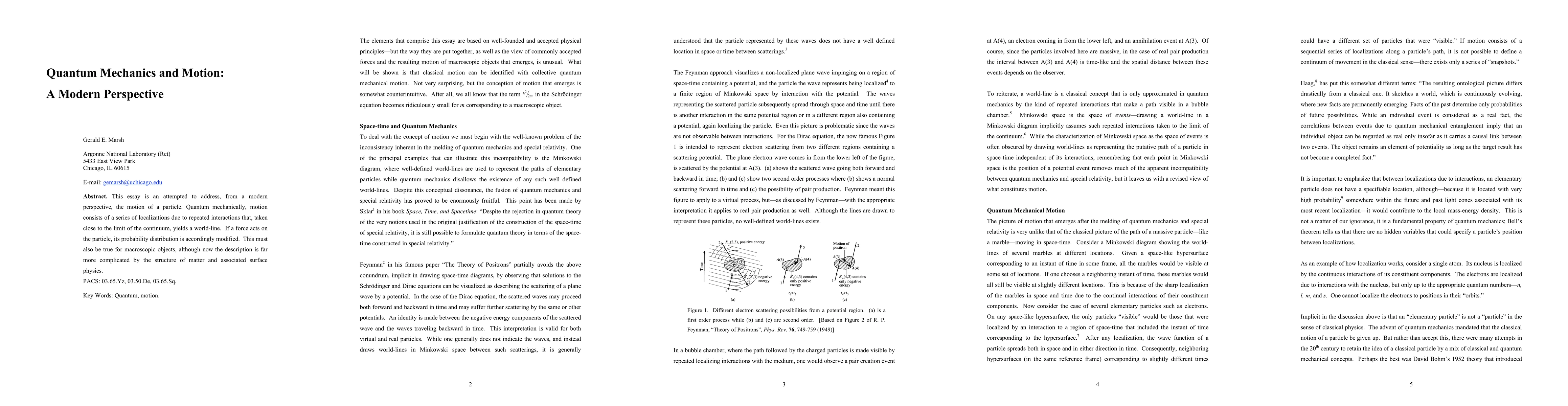 This essay is an attempted to address, from a modern perspective, the motion of a particle. Quantum mechanically, motion consists of a series of localizations due to repeated interactions that, taken close to the limit of the continuum, yields a world-line. If a force acts on the particle, its probability distribution is accordingly modified. This must also be true for macroscopic objects, although now the description is far more complicated by the structure of matter and associated surface physics.