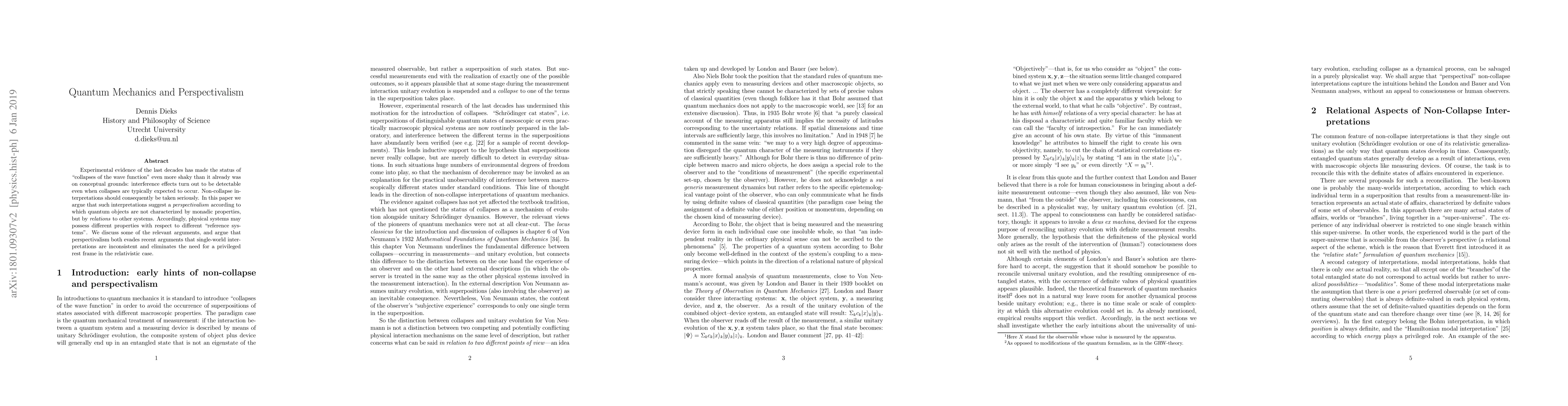 Experimental evidene of the last decades has made the status of "collapses of the wave function" even more shaky than it already was on conceptual grounds: interference effects turn out to be detectable even when collapses are typically expected to occur. Non-collapse interpretations should consequently be taken seriously. In this paper we argue that such interpretations suggest a perspectivalism according to which quantum objects are not characterized by monadic properties, but by relations to other systems. Accordingly, physical systems may possess different properties with respect to different "reference systems". We discuss some of the relevant arguments, and argue that perspectivalism both evades recent arguments that single-world interpretations are inconsistent and eliminates the need for a privileged rest frame in the relativistic case.