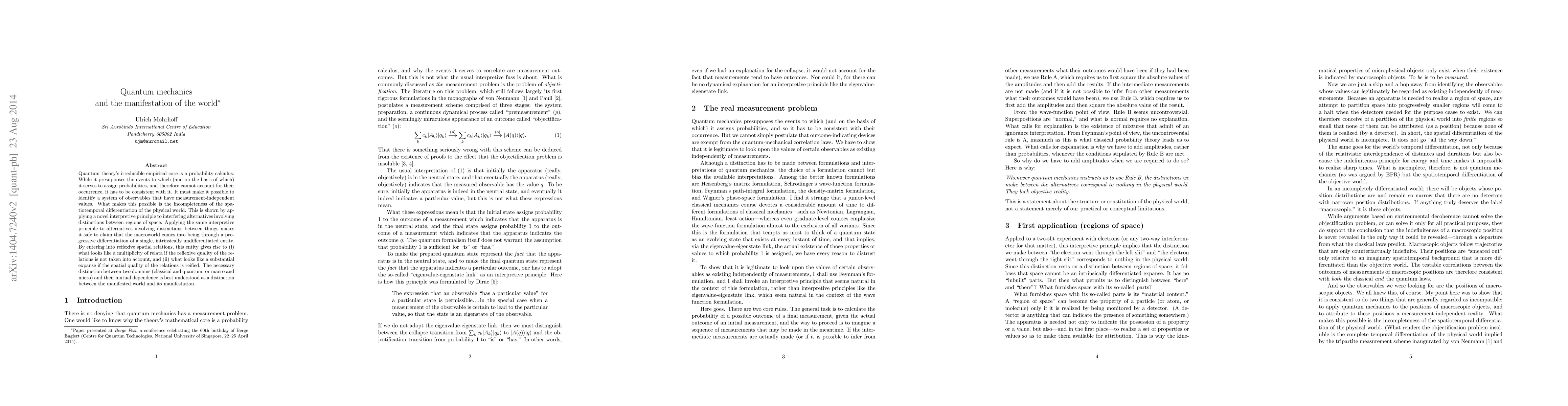 Quantum theory's irreducible empirical core is a probability calculus. While it presupposes the events to which (and on the basis of which) it serves to assign probabilities, and therefore cannot account for their occurrence, it has to be consistent with it. It must make it possible to identify a system of observables that have measurement-independent values. What makes this possible is the incompleteness of the spatiotemporal differentiation of the physical world. This is shown by applying a novel interpretive principle to interfering alternatives involving distinctions between regions of space. Applying the same interpretive principle to alternatives involving distinctions between things makes it safe to claim that the macroworld comes into being through a progressive differentiation of a single, intrinsically undifferentiated entity. By entering into reflexive spatial relations, this entity gives rise to (i) what looks like a multiplicity of relata if the reflexive quality of the relations is not taken into account, and (ii) what looks like a substantial expanse if the spatial quality of the relations is reified. The necessary distinction between two domains (classical and quantum, or macro and micro) and their mutual dependence is best understood as a distinction between the manifested world and its manifestation.