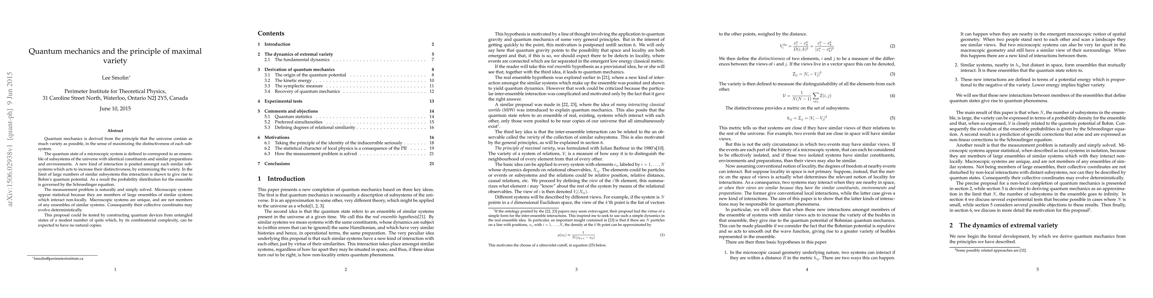 Quantum mechanics is derived from the principle that the universe contain as much variety as possible, in the sense of maximizing the distinctiveness of each subsystem. The quantum state of a microscopic system is defined to correspond to an ensemble of subsystems of the universe with identical constituents and similar preparations and environments. A new kind of interaction is posited amongst such similar subsystems which acts to increase their distinctiveness, by extremizing the variety. In the limit of large numbers of similar subsystems this interaction is shown to give rise to Bohm's quantum potential. As a result the probability distribution for the ensemble is governed by the Schroedinger equation. The measurement problem is naturally and simply solved. Microscopic systems appear statistical because they are members of large ensembles of similar systems which interact non-locally. Macroscopic systems are unique, and are not members of any ensembles of similar systems. Consequently their collective coordinates may evolve deterministically. This proposal could be tested by constructing quantum devices from entangled states of a modest number of quits which, by its combinatorial complexity, can be expected to have no natural copies.