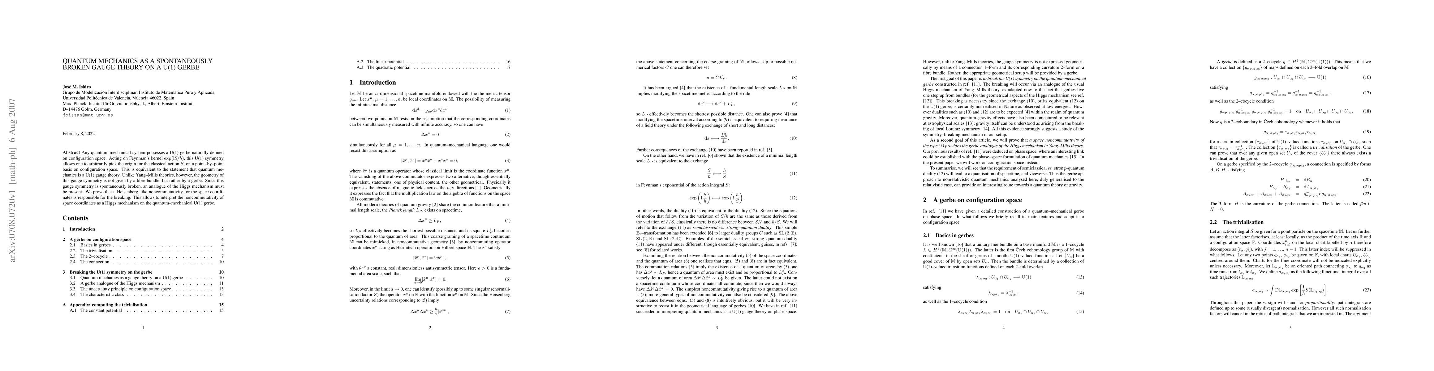 This research demonstrates that quantum mechanics can be viewed as a spontaneously broken U(1) gauge theory represented by a gerbe rather than a traditional fiber bundle. The noncommutativity of space coordinates is identified as the Higgs mechanism responsible for this spontaneous symmetry breaking.