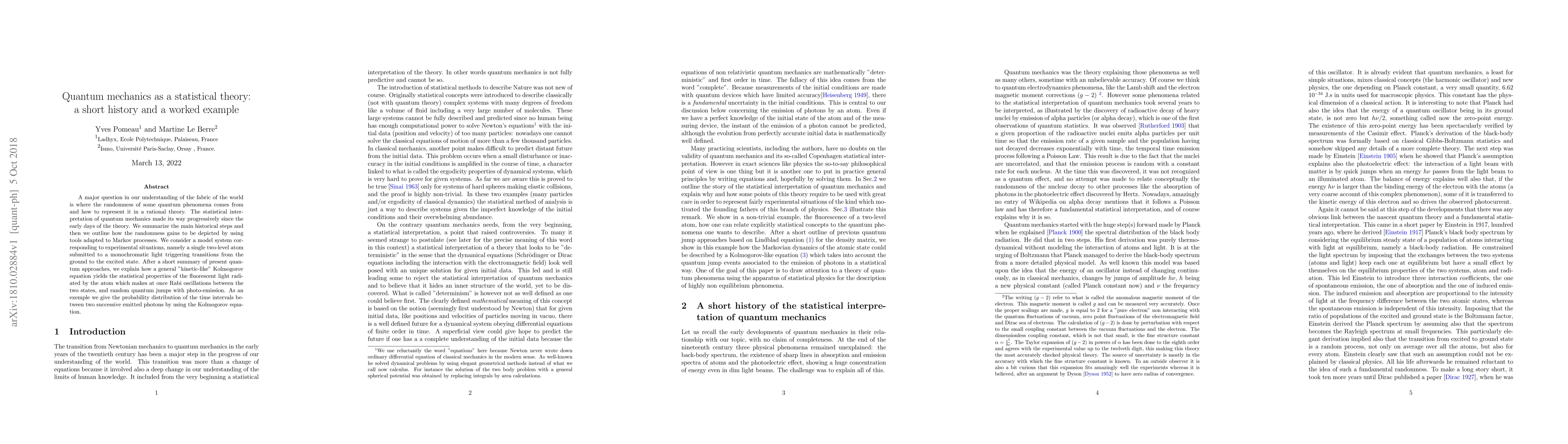 A major question in our understanding of the fabric of the world is where the randomness of some quantum phenomena comes from and how to represent it in a rational theory. The statistical interpretation of quantum mechanics made its way progressively since the early days of the theory. We summarize the main historical steps and then we outline how the randomness gains to be depicted by using tools adapted to Markov processes. We consider a model system corresponding to experimental situations, namely a single two-level atom submitted to a monochromatic light triggering transitions from the ground to the excited state. After a short summary of present quantum approaches, we explain how a general "kinetic-like" Kolmogorov equation yields the statistical properties of the fluorescent light radiated by the atom which makes at once Rabi oscillations between the two states, and random quantum jumps with photo-emission. As an exemple we give the probability distribution of the time intervals between two successive emitted photons by using the Kolmogorov equation.