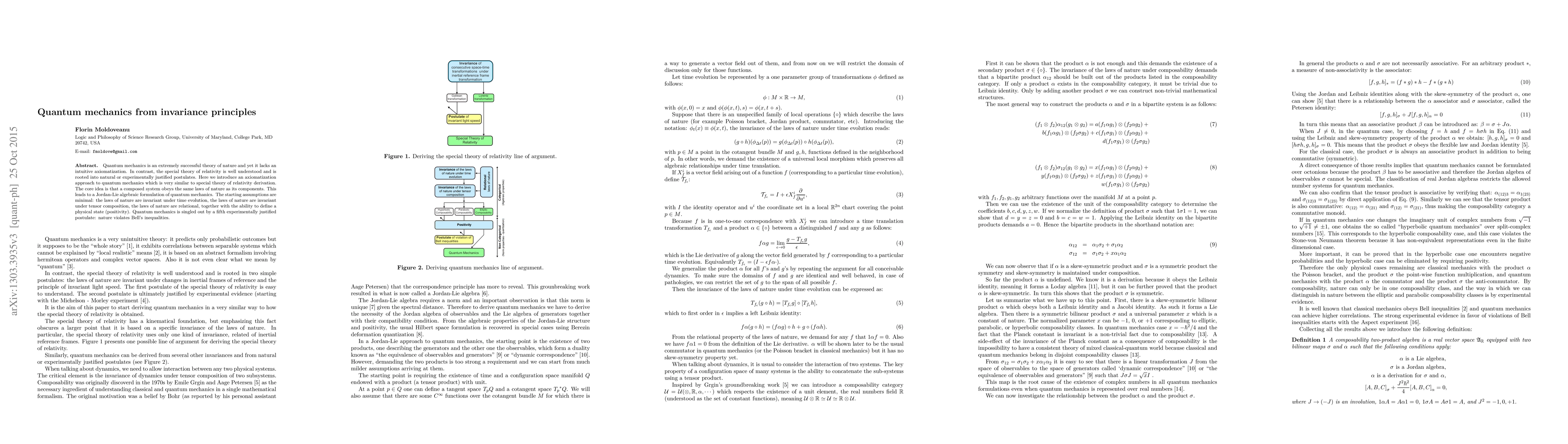 This paper proposes an axiomatization of quantum mechanics based on invariance principles similar to those used in special relativity, leading to a Jordan-Lie algebraic formulation. It identifies quantum mechanics through a minimal set of assumptions, including the invariance of natural laws and the violation of Bell inequalities.