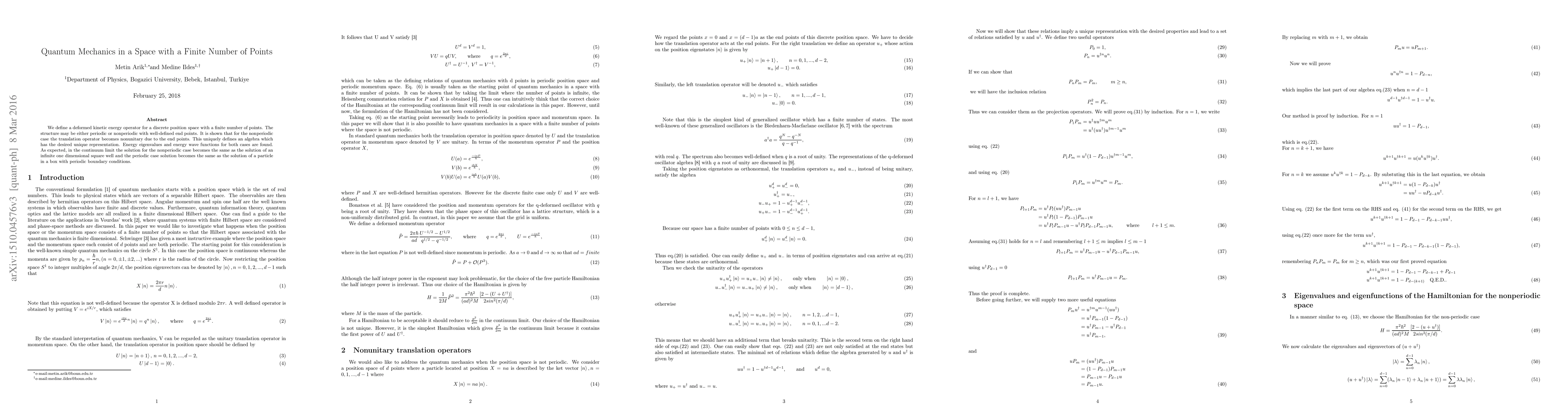 We define a deformed kinetic energy operator for a discrete position space with a finite number of points. The structure may be either periodic or nonperiodic with well-defined end points. It is shown that for the nonperiodic case the translation operator becomes nonunitary due to the end points. This uniquely defines an algebra which has the desired unique representation. Energy eigenvalues and energy wave functions for both cases are found. As expected, in the continuum limit the solution for the nonperiodic case becomes the same as the solution of an infinite one dimensional square well and the periodic case solution becomes the same as the solution of a particle in a box with periodic boundary conditions.