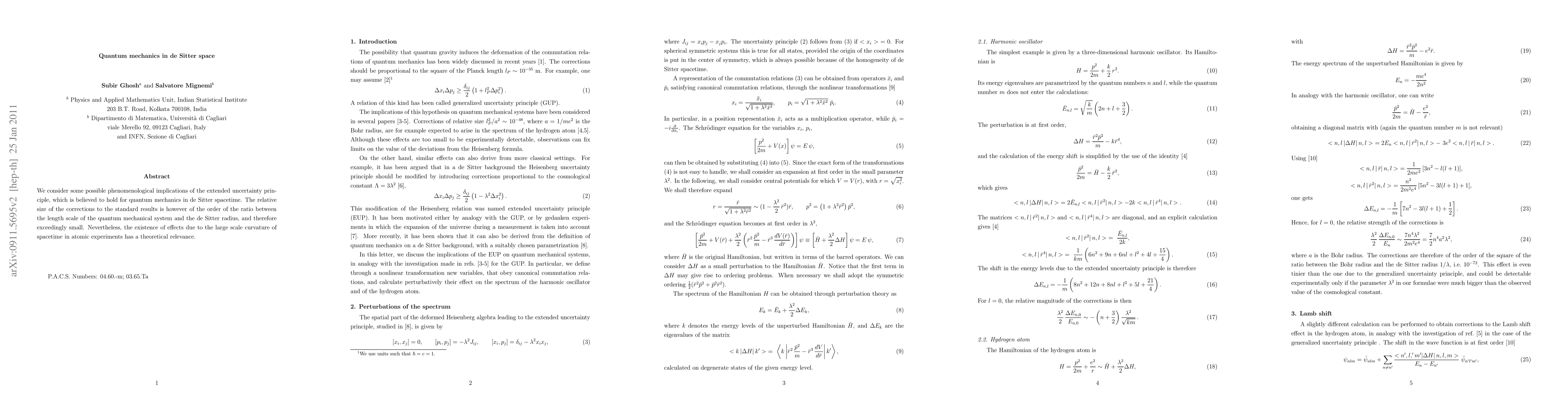 This paper explores the extended uncertainty principle's implications for quantum mechanics in de Sitter space, revealing minute corrections due to the spacetime's large-scale curvature. Despite their negligible size, these effects hold theoretical significance for atomic experiments.