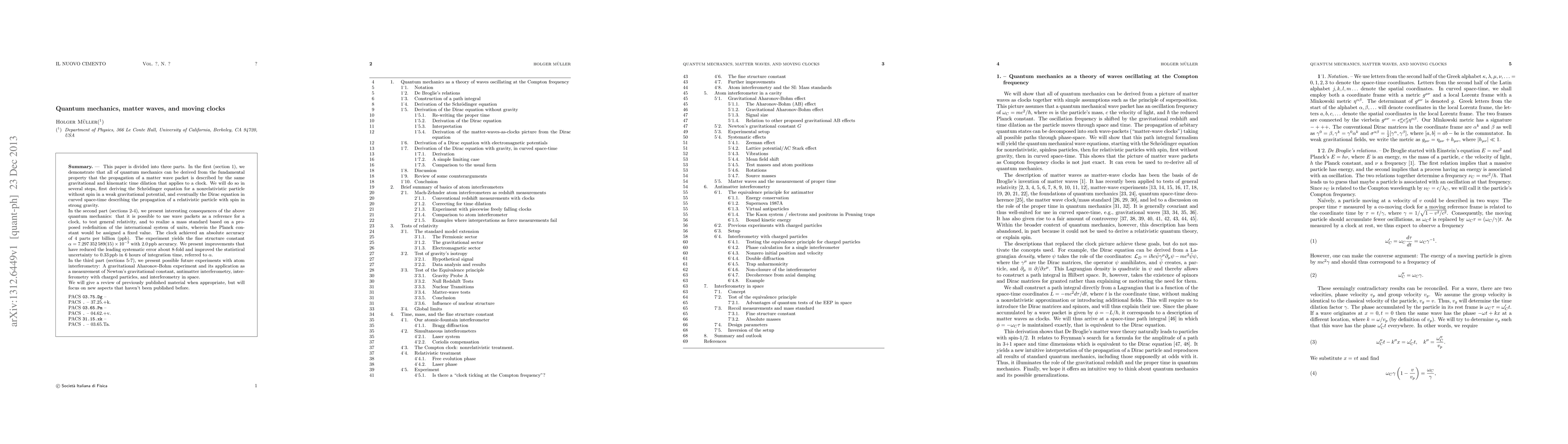 This paper is divided into three parts. In the first (section 1), we demonstrate that all of quantum mechanics can be derived from the fundamental property that the propagation of a matter wave packet is described by the same gravitational and kinematic time dilation that applies to a clock. We will do so in several steps, first deriving the Schroedinger equation for a nonrelativistic particle without spin in a weak gravitational potential, and eventually the Dirac equation in curved space-time describing the propagation of a relativistic particle with spin in strong gravity. In the second part (sections 2-4), we present interesting consequences of the above quantum mechanics: that it is possible to use wave packets as a reference for a clock, to test general relativity, and to realize a mass standard based on a proposed redefinition of the international system of units, wherein the Planck constant would be assigned a fixed value. The clock achieved an absolute accuracy of 4 parts per billion (ppb). The experiment yields the fine structure constant $\alpha = 7.297\,352\,589(15) \times 10^{-3}$ with 2.0 ppb accuracy. We present improvements that have reduced the leading systematic error about 8-fold and improved the statistical uncertainty to 0.33 ppb in 6 hours of integration time, referred to $\alpha$. In the third part (sections 5-7), we present possible future experiments with atom interferometry: A gravitational Aharonov-Bohm experiment and its application as a measurement of Newton's gravitational constant, antimatter interferometry, interferometry with charged particles, and interferometry in space. We will give a review of previously published material when appropriate, but will focus on new aspects that haven't been published before.
