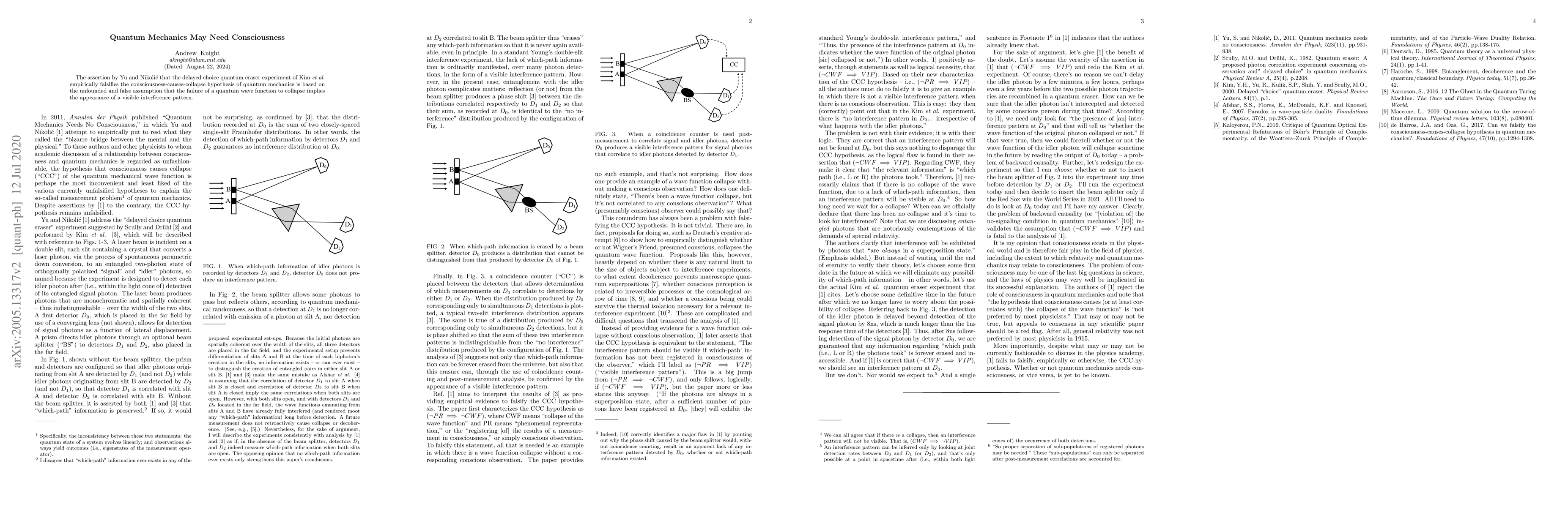 Summary: Yu and Nikolic incorrectly argue that the delayed choice quantum eraser experiment disproves the consciousness-collapse hypothesis, as they mistakenly link the absence of wave function collapse to visible interference patterns. This misinterpretation undermines their conclusion.