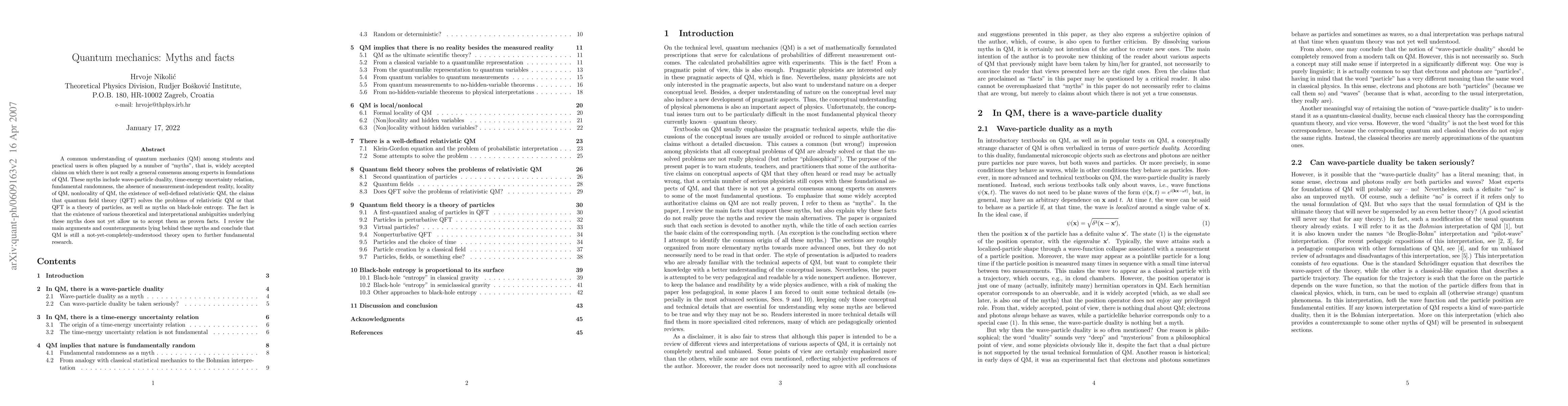 A common understanding of quantum mechanics (QM) among students and practical users is often plagued by a number of "myths", that is, widely accepted claims on which there is not really a general consensus among experts in foundations of QM. These myths include wave-particle duality, time-energy uncertainty relation, fundamental randomness, the absence of measurement-independent reality, locality of QM, nonlocality of QM, the existence of well-defined relativistic QM, the claims that quantum field theory (QFT) solves the problems of relativistic QM or that QFT is a theory of particles, as well as myths on black-hole entropy. The fact is that the existence of various theoretical and interpretational ambiguities underlying these myths does not yet allow us to accept them as proven facts. I review the main arguments and counterarguments lying behind these myths and conclude that QM is still a not-yet-completely-understood theory open to further fundamental research.
