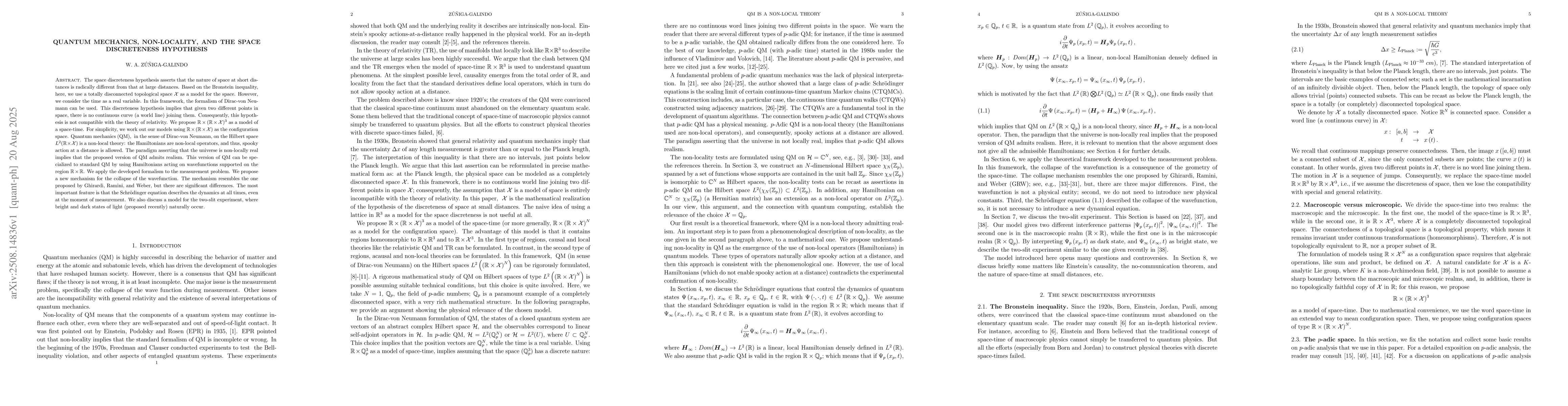 The space discreteness hypothesis asserts that the nature of space at short distances is radically different from that at large distances. Based on the Bronstein inequality, here, we use a totally disconnected topological space $\mathcal{X}$ as a model for the space. However, we consider the time as a real variable. In this framework, the formalism of Dirac-von Neumann can be used. This discreteness hypothesis implies that given two different points in space, there is no continuous curve (a world line) joining them. Consequently, this hypothesis is not compatible with the theory of relativity. We propose $\mathbb{R}\times(\mathbb{R}\times\mathcal{X})^{3}$ as a model of a space-time. For simplicity, we work out our models using $\mathbb{R}\times(\mathbb{R}\times\mathcal{X})$ as the configuration space. Quantum mechanics (QM), in the sense of Dirac-von Neumann, on the Hilbert space $L^{2}(\mathbb{R}\times\mathcal{X})$ is a non-local theory: the Hamiltonians are non-local operators, and thus, spooky action at a distance is allowed. The paradigm asserting that the universe is non-locally real implies that the proposed version of QM admits realism. This version of QM can be specialized to standard QM by using Hamiltonians acting on wavefunctions supported on the region $\mathbb{R}\times\mathbb{R}$. We apply the developed formalism to the measurement problem. We propose a new mechanism for the collapse of the wavefunction. The mechanism resembles the one proposed by Ghirardi, Ramini, and Weber, but there are significant differences. The most important feature is that the Schr\"{o}dinger equation describes the dynamics at all times, even at the moment of measurement. We also discuss a model for the two-slit experiment, where bright and dark states of light (proposed recently) naturally occur.