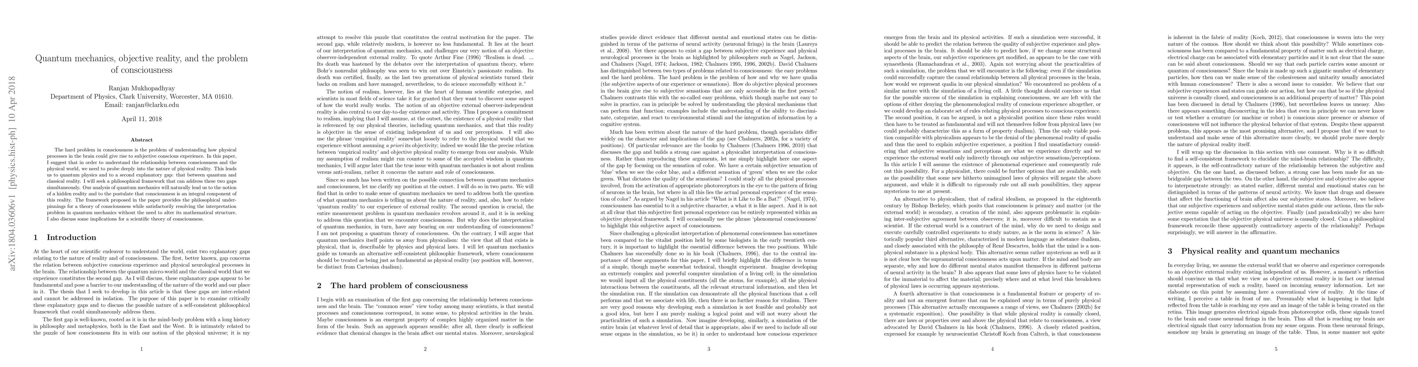 The hard problem in consciousness is the problem of understanding how physical processes in the brain could give rise to subjective conscious experience. In this paper, I suggest that in order to understand the relationship between consciousness and the physical world, we need to probe deeply into the nature of physical reality. This leads us to quantum physics and to a second explanatory gap: that between quantum and classical reality. I will seek a philosophical framework that can address these two gaps simultaneously. Our analysis of quantum mechanics will naturally lead us to the notion of a hidden reality and to the postulate that consciousness is an integral component of this reality. The framework proposed in the paper provides the philosophical underpinnings for a theory of consciousness while satisfactorily resolving the interpretation problem in quantum mechanics without the need to alter its mathematical structure. I also discuss some implications for a scientific theory of consciousness.