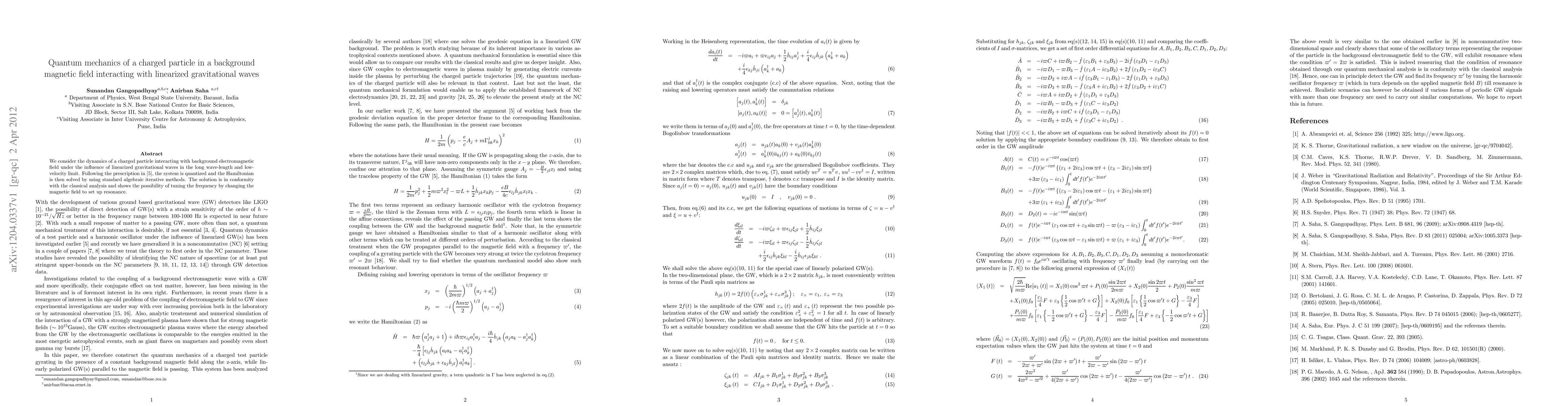 Summary: This research quantizes the dynamics of a charged particle in an electromagnetic field influenced by linearized gravitational waves, revealing a method to achieve resonance by adjusting the magnetic field frequency. The Hamiltonian solution aligns with classical analysis.