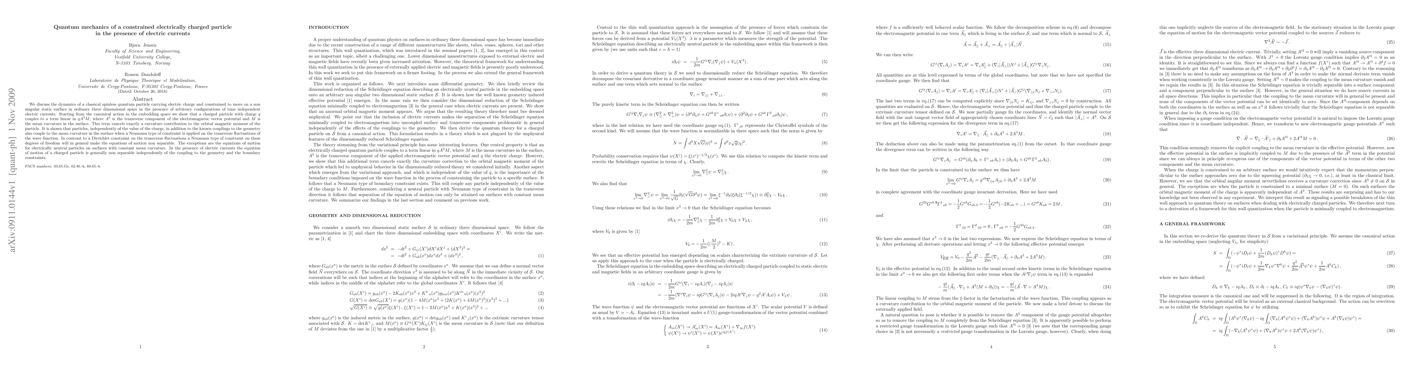 This paper explores the quantum mechanics of a charged particle constrained to move on a static surface in the presence of electric currents, revealing that the particle couples to both the surface's mean curvature and the electromagnetic vector potential, with the coupling terms affecting the particle's dynamics and potentially rendering the equations of motion non-separable.