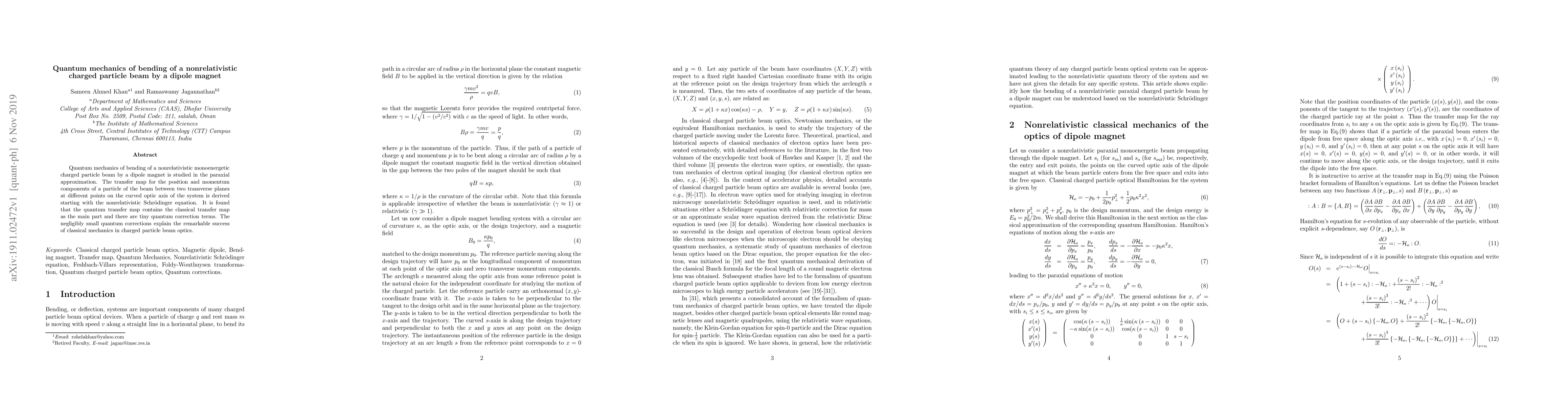This paper derives the quantum transfer map for a nonrelativistic charged particle beam bending in a dipole magnet, showing that classical mechanics provides a nearly accurate description due to negligible quantum correction terms. The study uses the nonrelativistic Schrödinger equation in the paraxial approximation.